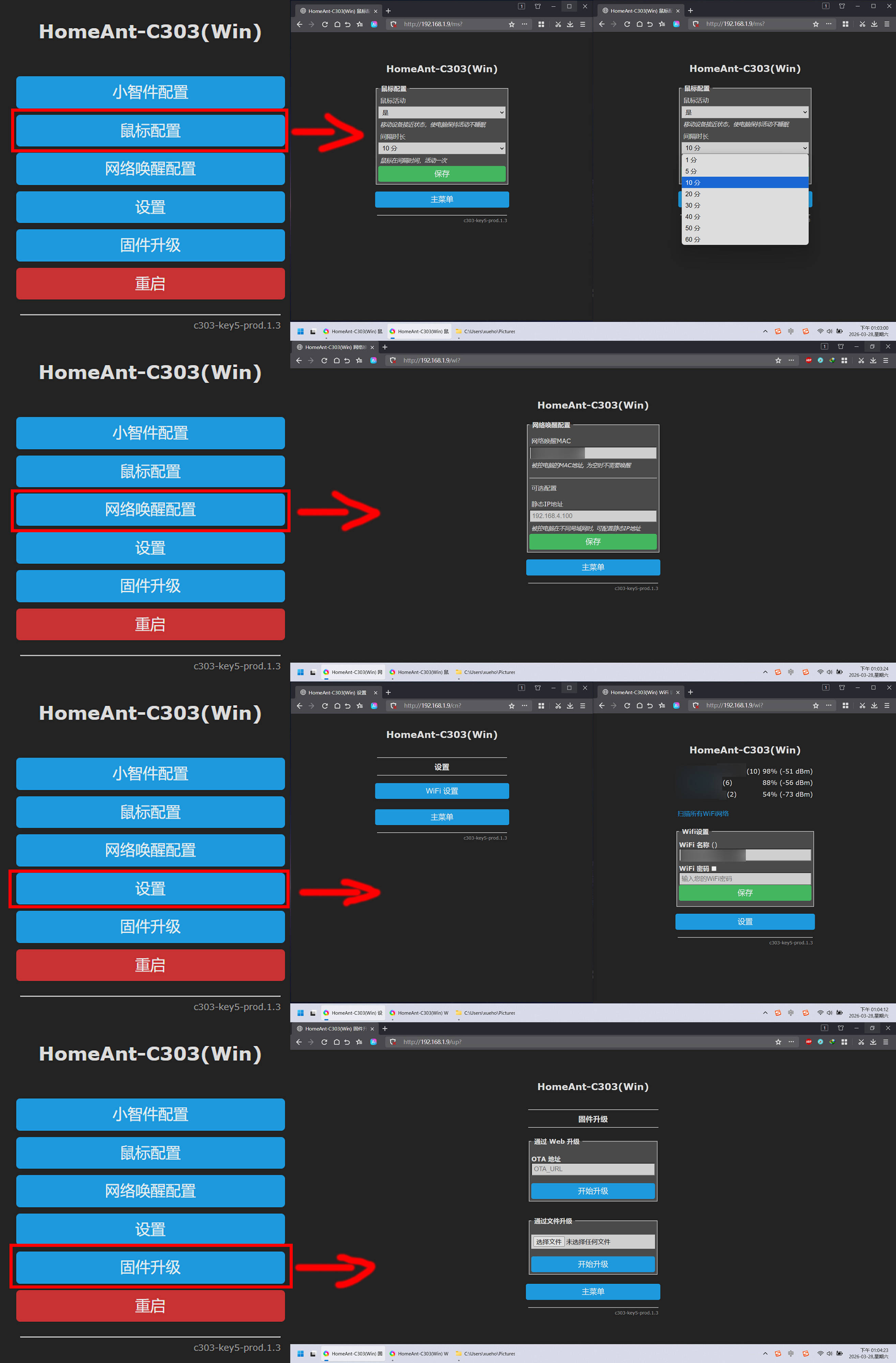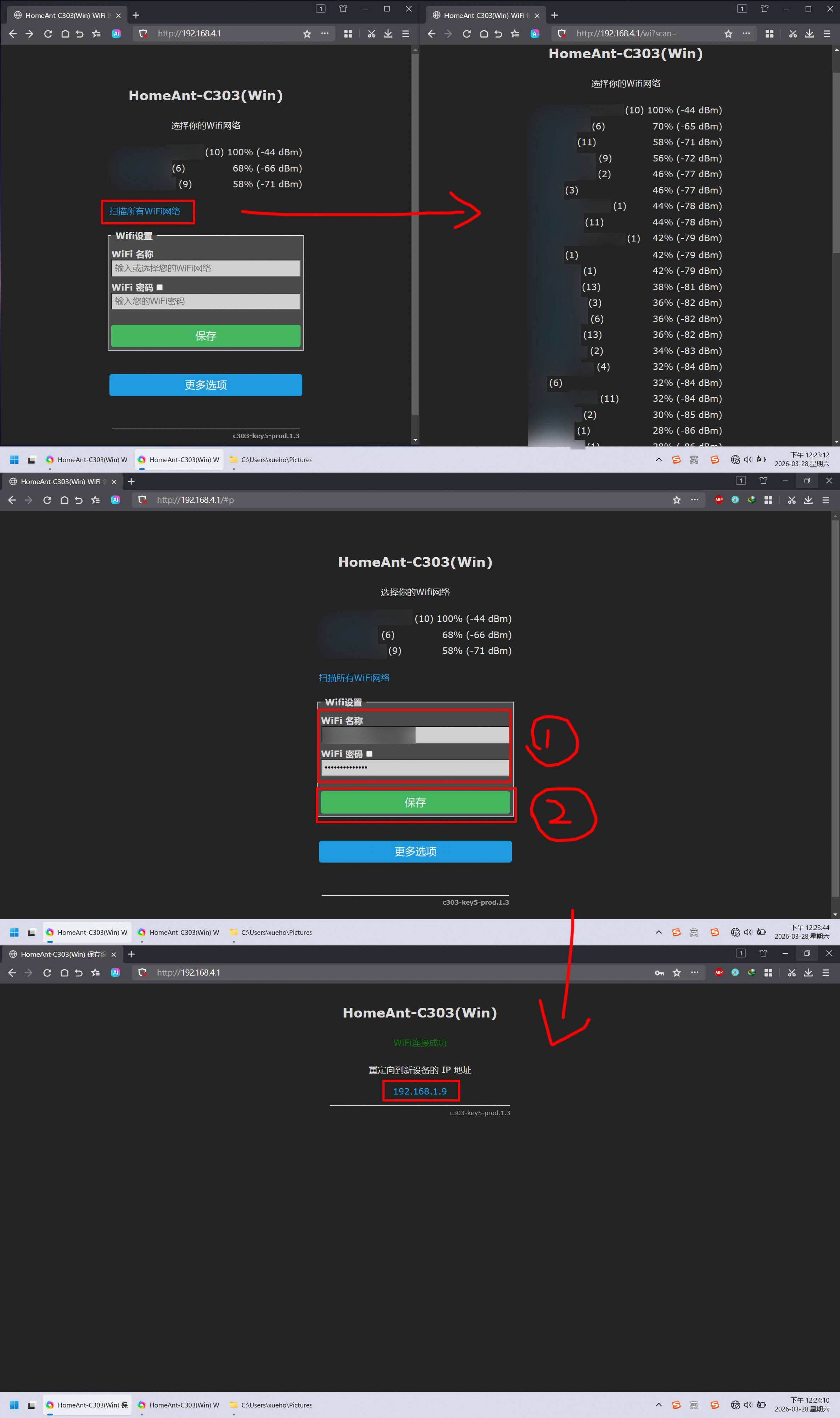 ▼连上热点后,通过浏览器进入 http://HA-1234.local (1234换成具体名称)或 http://192.168.10.1,初次进入后台会先让你连接一个Wi-Fi,默认显示信号最强的三个,找到并点击自己常用的那一个,填入Wi-Fi密码后保存即可,如果列表里没显示你需要连接的Wi-Fi,那就点击左下角“扫描所有Wi-Fi网络”,提示“WiFi连接成功”的提示后,进入后台的IP地址会自动重定向成你当前连接Wi-Fi所属的网段,直接点击进入或复制后手动进入都可以