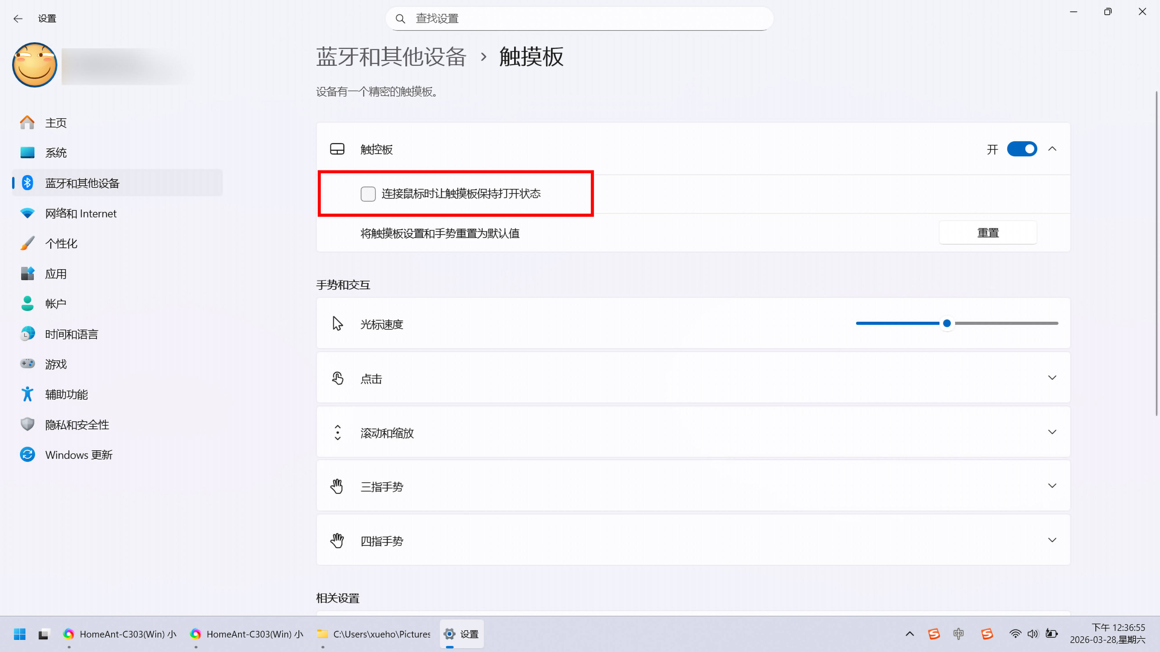 ▼这个小智件在电脑端是被识别为鼠标,如果你用的笔记本,连上小智件蓝牙瞬间可能会出现触控板失去控制的情况,你可以先接入一个鼠标,进入系统的设置里开启触控板的“连接鼠标保持触控板打开”或关闭“连接鼠标自动禁用触控板”的开关即可解决