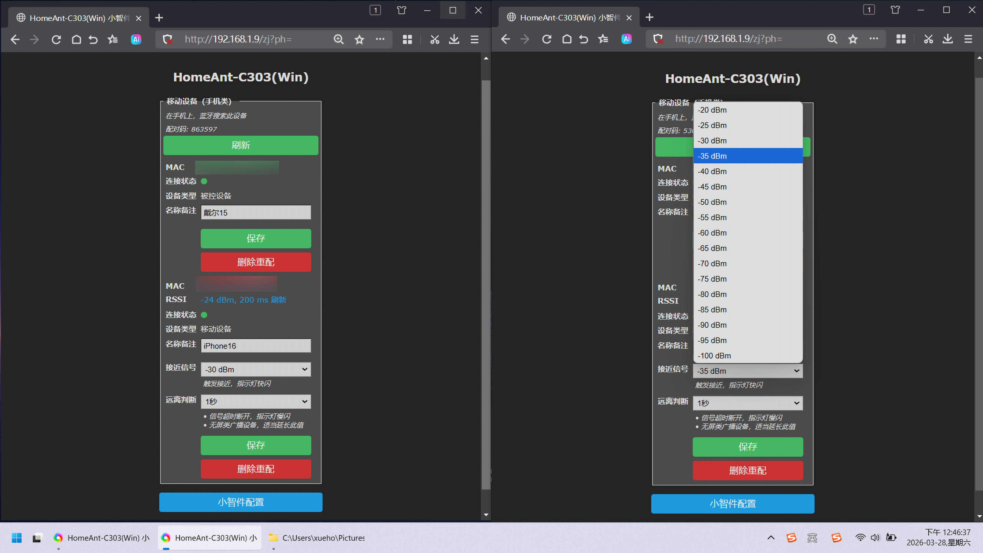 ▼其实这款小智件主要是通过手机和小智件连接的蓝牙信号强度变化来判断远离还是靠近,所以只需要把手机放在你需要开始执行自动解锁的距离下,点击RSSI后的刷新看看当前信号强度为负多少dBm,再把接近信号设置到比实时信号强度的数字再大一两档即可,如实时信号为-25dBm,设置为-30dBm或-35dBm就可以了(负符号后数字越大表示信号强度越弱,电脑触发自动解锁的距离就越远,也就是移动设备靠近时电脑越早自动解锁,反之越近)