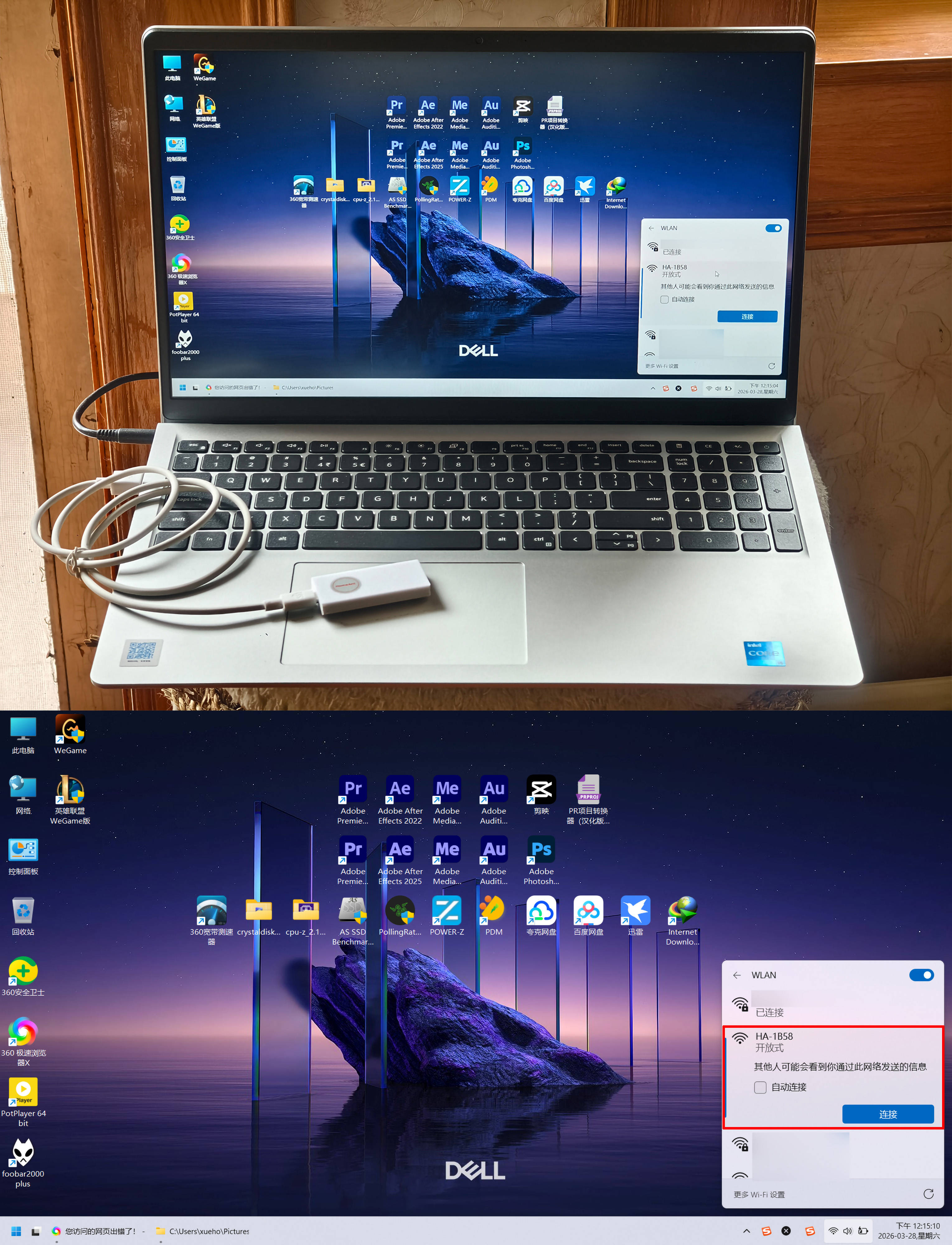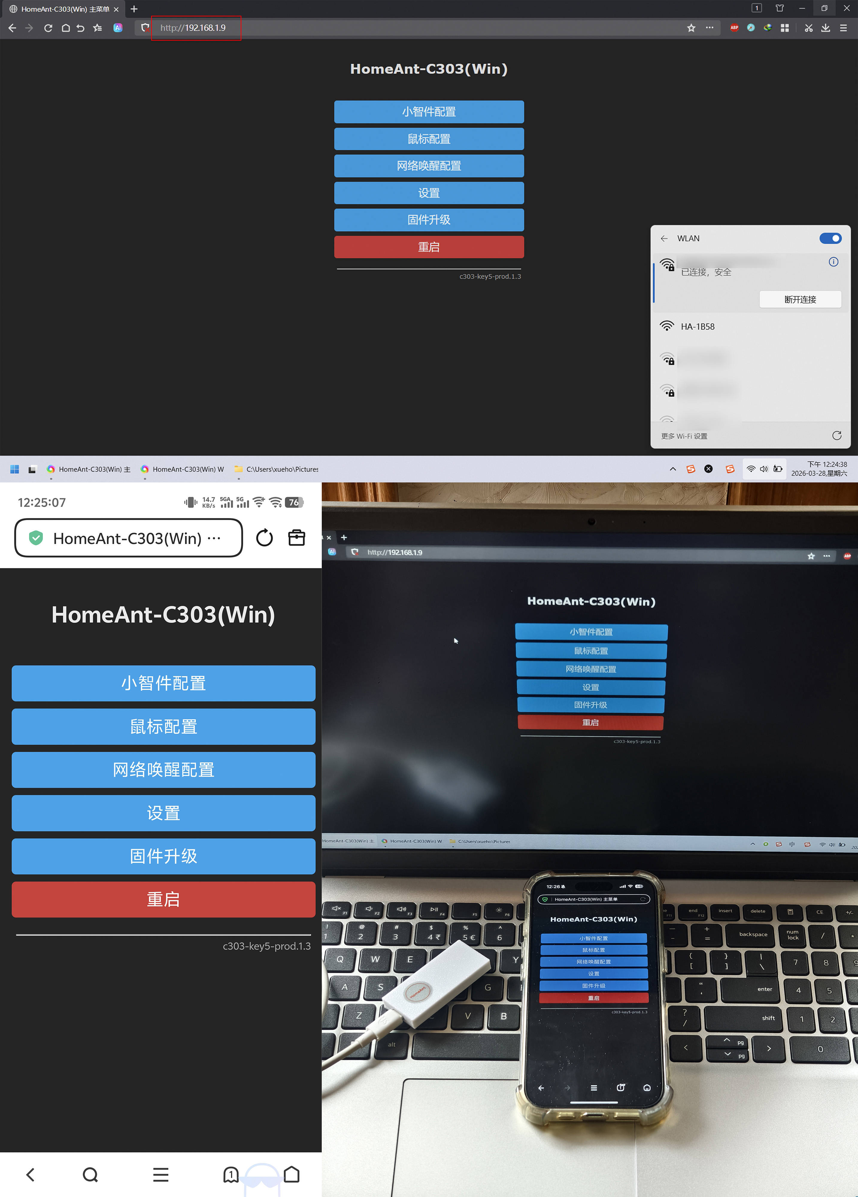 ▼首先用一根type-c的电源线连接小智件,推荐电源单独供电,防止电脑会睡眠,这里用电脑仅演示使用;手机或电脑,搜索找到一个名为“HA-1234”的无密码热点并连接它(1234换成具体名称)