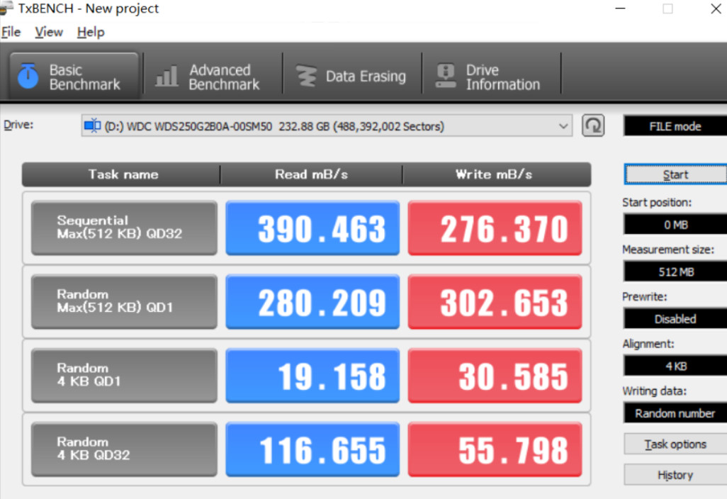 在TxBench 测试中,读取速度为390MB/s、写入速度为276MB/s,而在4K测试上,表现略微不足。