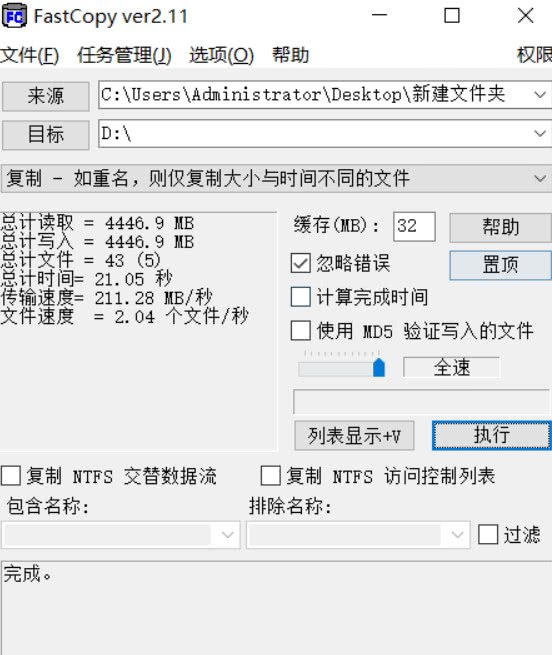 在FastCopy测试中,整个文件夹包括图片、文档、视频共有40多个文件,大小4.5G左右,实际测试中传输速度211M/S,耗时21秒,这个速度应该说已经是相当快了。