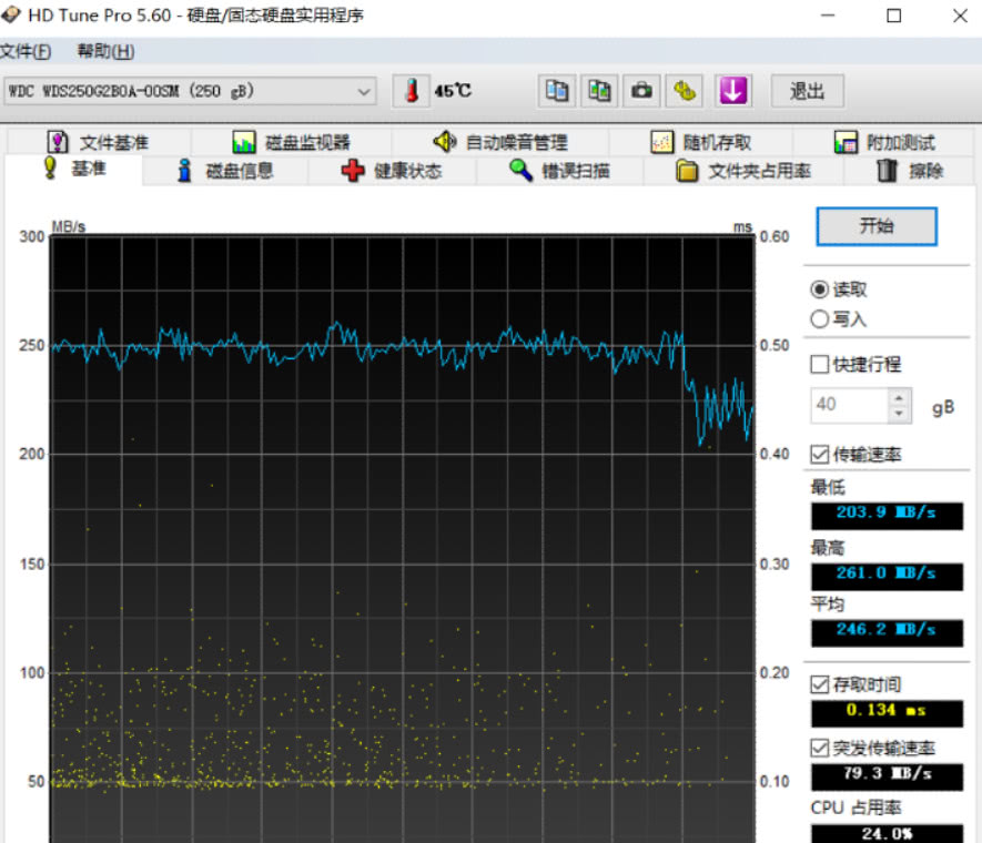 在HD Tune Pro的基准测试中,可以看到硬盘读取速度比较稳定,最高达到了261M/S,最低203.9M/S,基本处于250M/S左右,性能还是比较稳定的。