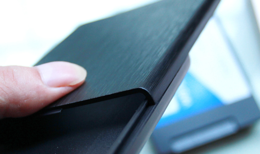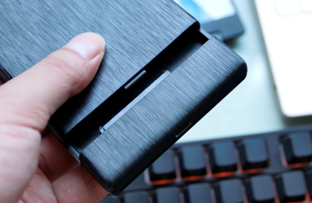 由于奥睿科硬盘盒采用的是免工具安装设计,安装硬盘非常简单,特别是这种带纹理的材质,轻推后盖,装入硬盘即可,之后将后盖内侧贴上防震垫,轻松3秒安装完毕。