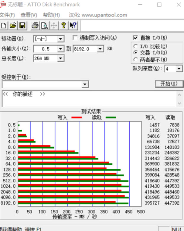 在ATTO 的测试中,WD Blue 250GB SSD的读取速度为447MB/s、写入速度为395MB/s,性能表现不错。