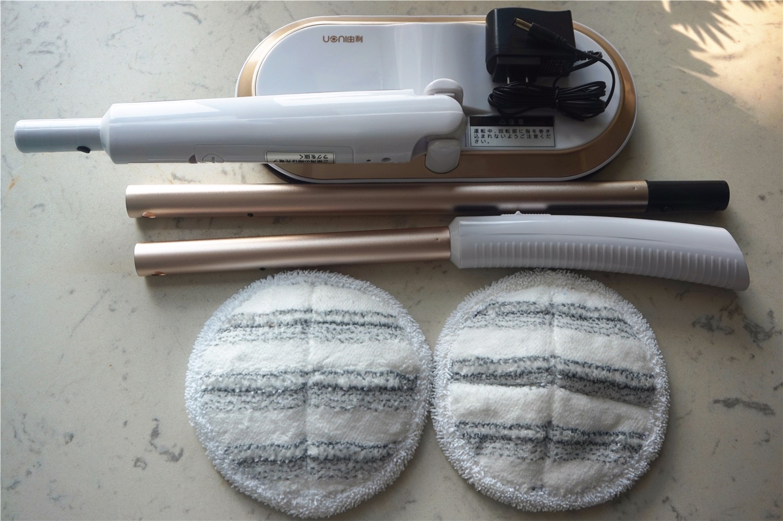 由利电动拖把分为土豪金、 蔷薇红两种颜色,本次到手的是金色。配件分别包含:电动拖把1个,电源适配器1个,太空灰拖布2对,拖把杆2根,说明书1份。