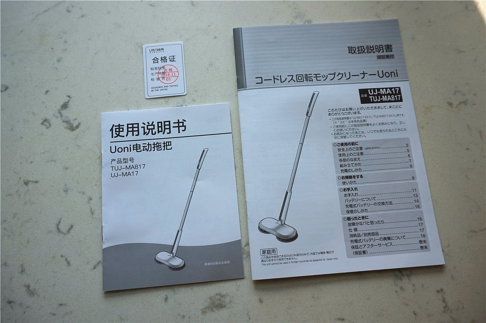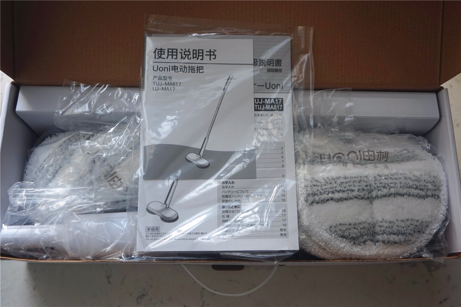 打开包装盒,我们会看到由利电动拖把相关配件及使用说明书。虽说产品是来自拥有百年历史的日本品牌UONI由利,不过制造商却由中国深圳生产并配备了中文使用说明书,这个说明书要给点赞。