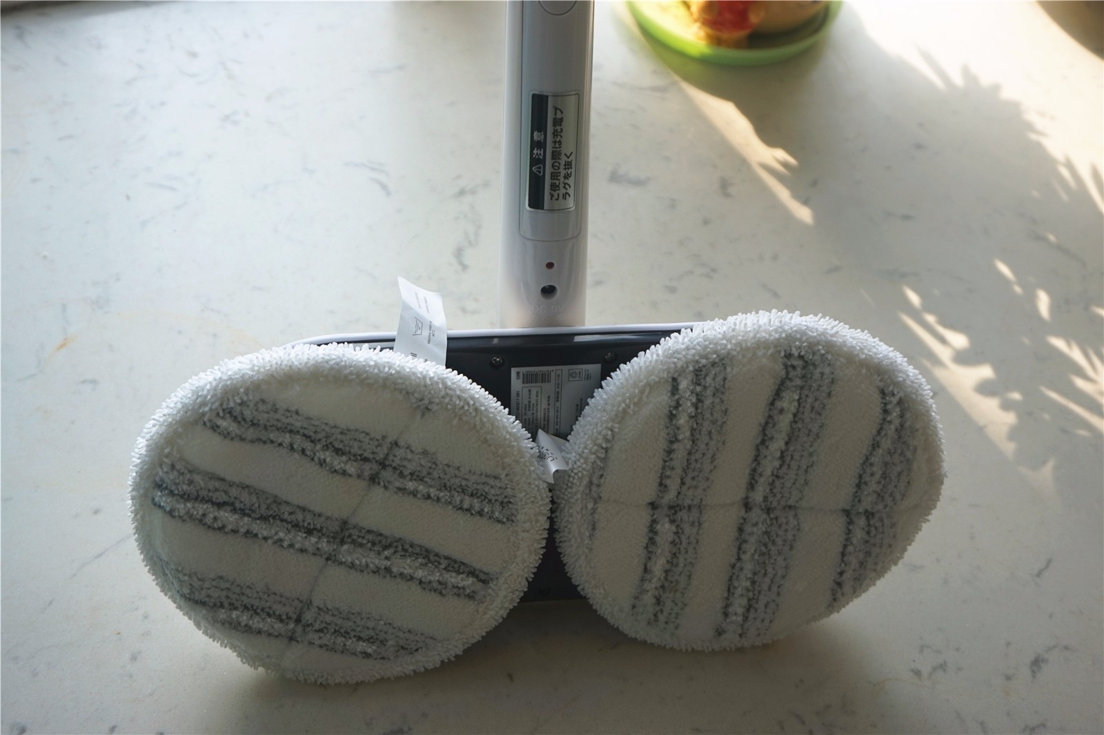 由利电动拖把主体由两个相同大小的转盘构成,两个转盘同时工作,且由外向内的进行旋转,这样有利于把灰尘集中起来。中间部分采用圆形磨术贴设计,配件太空灰拖布就是要安装这上面来使用的。安装完成后发现有点像双刀网的剃须刀,不过拖布拆装很简单也方便清洗。