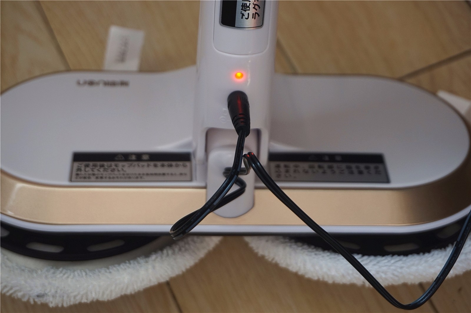 由利电动拖把由于采用无线电动工作原理,所以机身内置锂电池,充电器为9V 0.5A,每次充满电需要3-4小时左右,充电接口上方还带有充电指示灯。