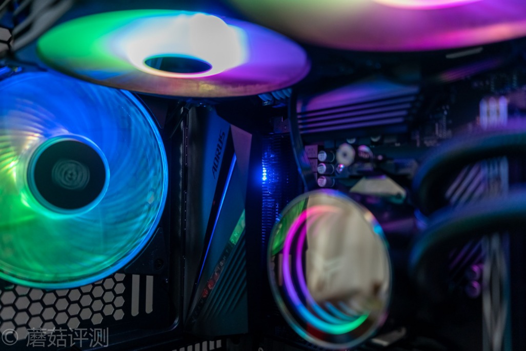 ▼在ARGB的灯效模式下,可以看到非常梦幻的一圈一圈色环的效果,很漂亮。另外,这个显卡侧面的技嘉的LOGO部分也可以亮,灯光很柔和,很好看