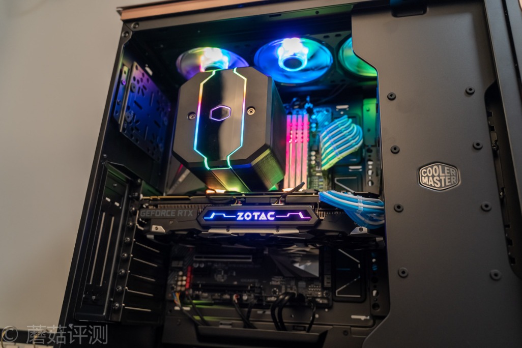 ▼机箱顶部使用了酷冷至尊的360模组扇,辅助机箱内部的垂直风道的建立,当然,其灯效也是很漂亮的