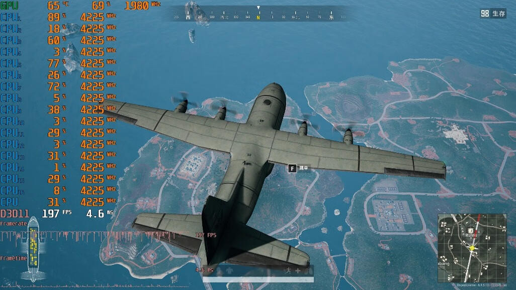 ▼接着吃个鸡,游戏实测下。1080P分辨率,全高画质,飞机上帧数可以稳定在200帧左右