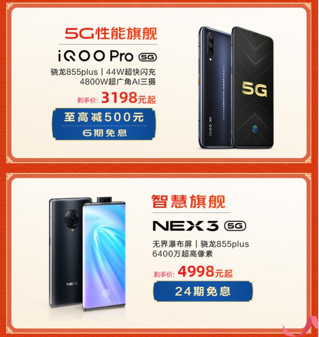 NEX 3 5G和iQOO Pro 5G版自从发布以来人气一直居高不下。NEX 3 5G具有极具科技感和视觉冲击的外观设计,硬件采用的也是行业顶级产品,是5G机型中少有的全能型旗舰手机,而iQOO Pro 5G版则以强悍的性能和顶级的游戏体验征服了大量用户。本次活动中在两大平台入手NEX 3 5G的实际到手价为4998起,而且还能享受12期免息和加赠蓝牙耳机的福利。iQOO Pro 5G版的实际到手价也只要3198起,可享包括6期免息和半年碎屏宝在内的福利。