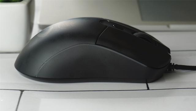 整体黑色的设计显得非常稳重,而且除了好看的颜值外,弧度也是十分柔和,采用了人体工程学设计,左高右低的上盖曲线设计的符合手掌曲线弧度,对于大部分人的握持来说大小非常的适中。