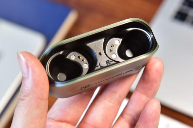 ▲收纳盒内部展示,较深,有左右标识,不知各位看得出来充电触点两侧各有两块磁铁,所以其腔体是靠磁铁吸附和收纳盒造型固定的;