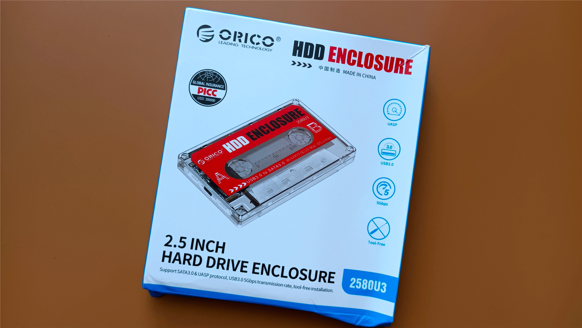 ORICO磁带硬盘盒外包装正面印有产品的名称、功能及外观。