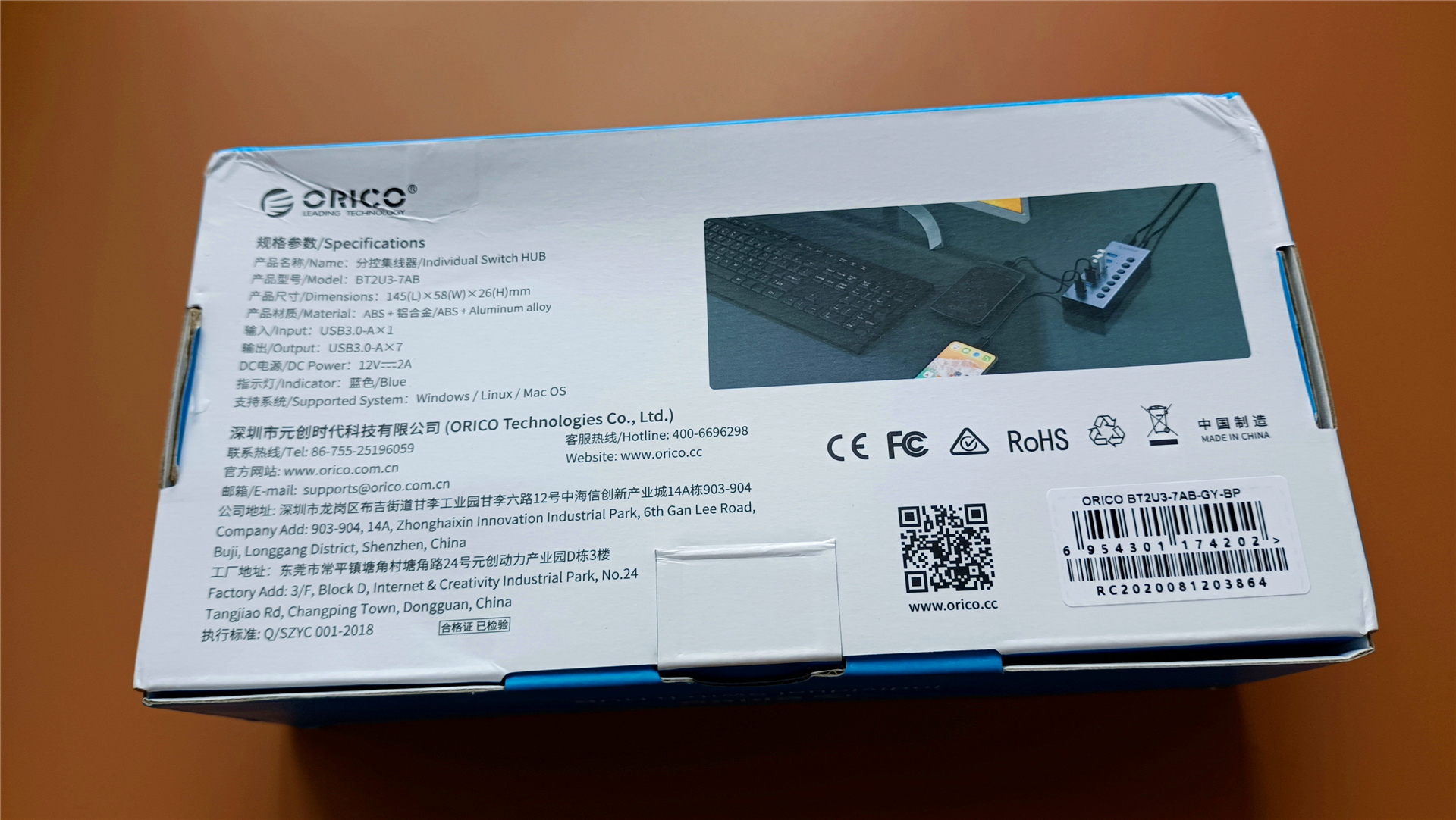 ORICO多口USB3.0 扩展器背面则主要印有产品的型号、规格参数、材质以及制造厂家的相关信息等。