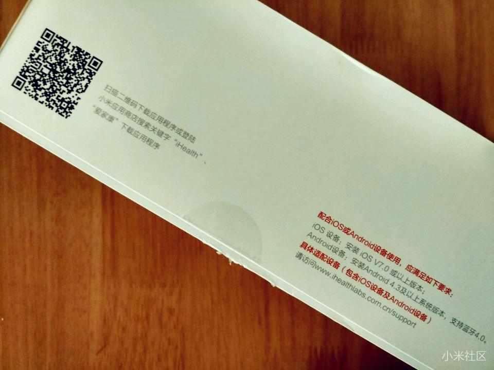 ▼盒子侧面的有“爱家康”APP的二维码,扫描下载安装APP,连接蓝牙即可使用;同时还有iHealth智能血压计的适配设备要求,ISO V7.0及以上版本、Android4.3及以上系统版本,支持蓝牙4.0。