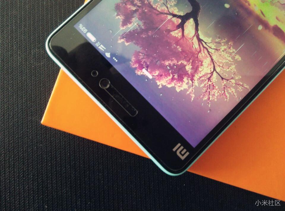 小米4c的正面,左上角有小米的LOGO,中间是听筒以及前置摄像头。