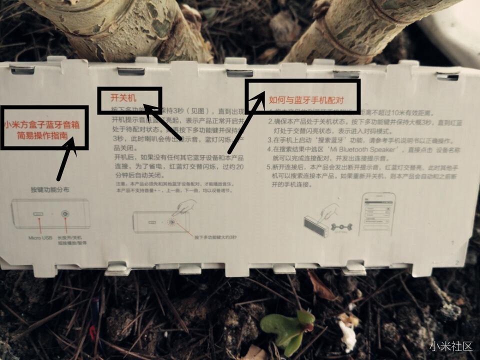 硬纸片的背面是说明书,有小米方盒子蓝牙音箱简易操作指南:包括开关机以及如何与蓝牙手机配对。