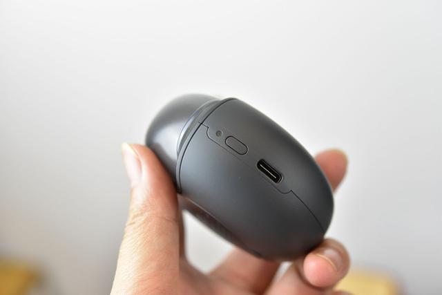 ▲在收纳盒的一侧有个TypeC充电孔,充电孔旁边的按键就是蓝牙配对键,初次使用时滑开收纳盒的盖子,然后长按此键3秒即可进入配对状态,旁边和耳机上同时有显示灯可看。