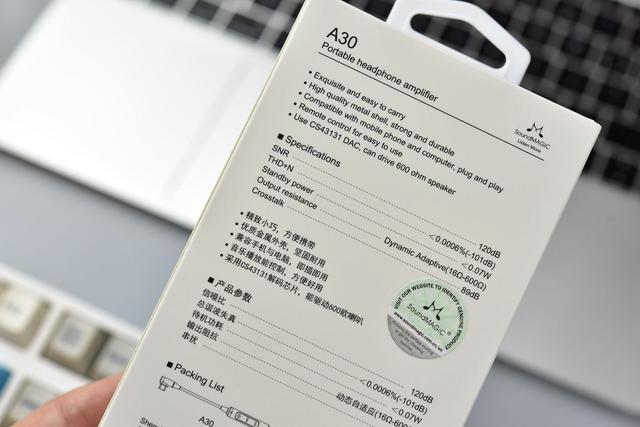 ▲这是声美最新推出的A30耳放,据说声美早些年之前亦推过耳放,不过当时的市场并没合适的土壤,所以还是做老本行了。包装盒背后有详细的参数,用的是CS43131解码芯片,官宣可推动600欧的耳机,咱就先当个噱头留个伏笔。