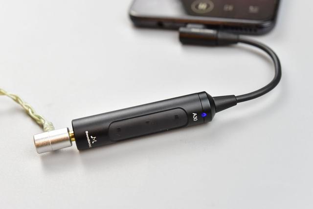 ▲和目前市面上越来越花哨的耳放线相比,声美的这款A30外观还是比较朴实的,仅黑色一种配色,主控部分是圆筒状,有调音量和暂停/开始以及切歌功能,接手机后会亮蓝灯,如果播放文件是DSD文件,此处则亮绿灯。