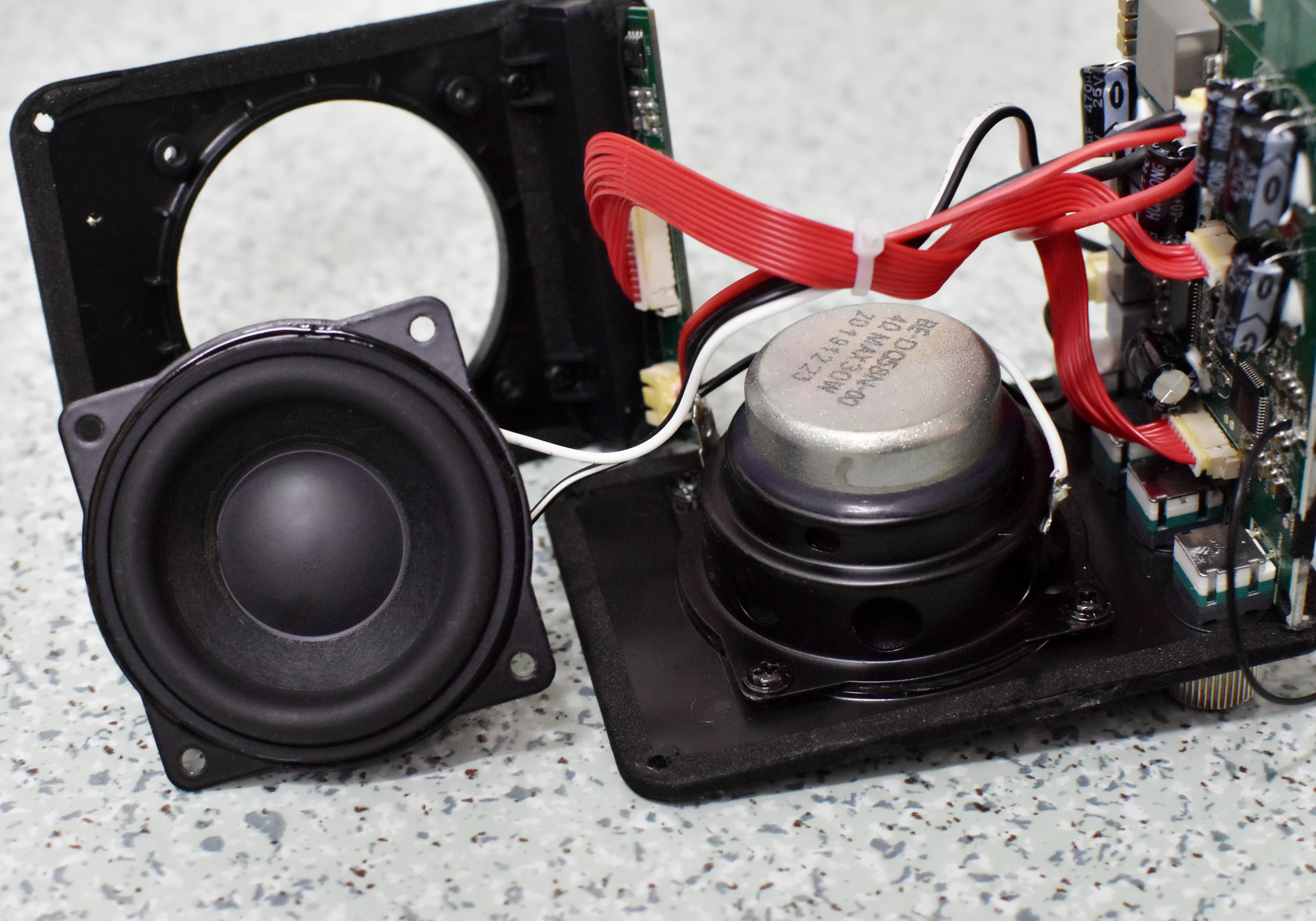 顺利拆开金属网后可见两侧的扬声器,可以看到里面的固定侧板为塑料材质,采用螺丝固定,这下拆卸起来应该看到希望了,准备螺丝刀继续下一步拆解。