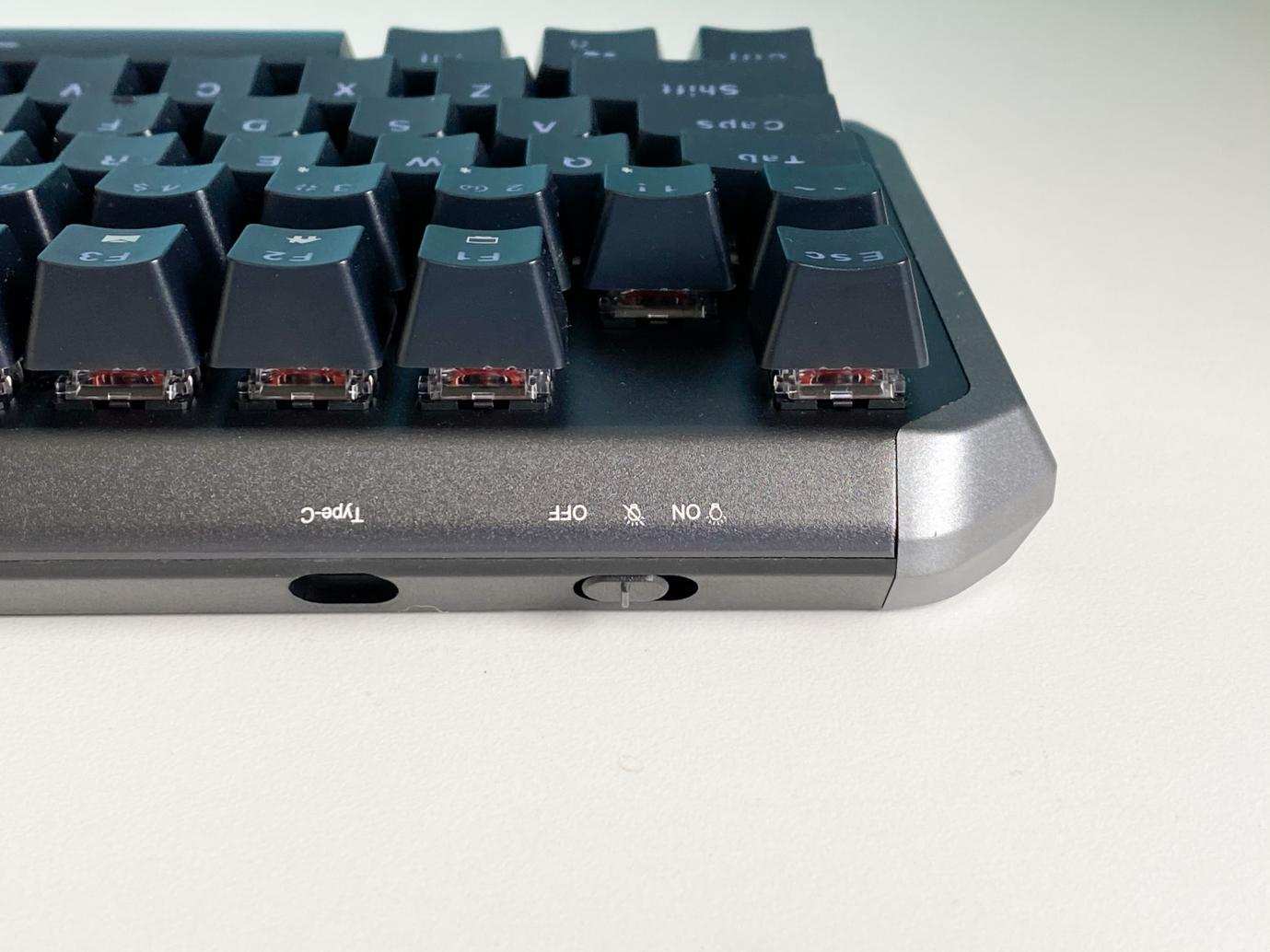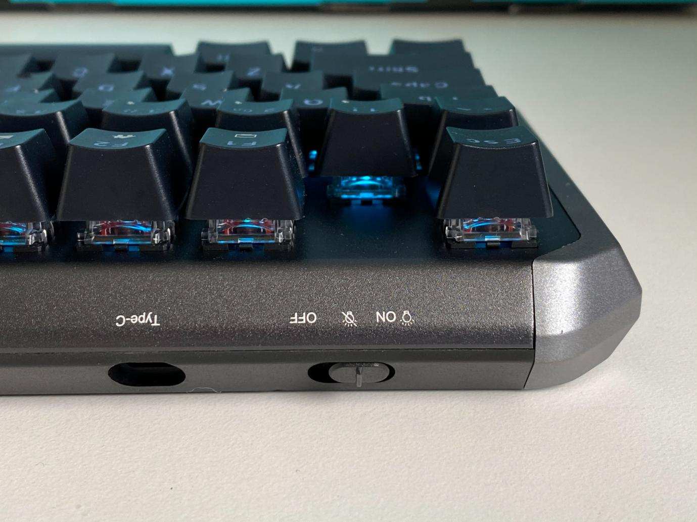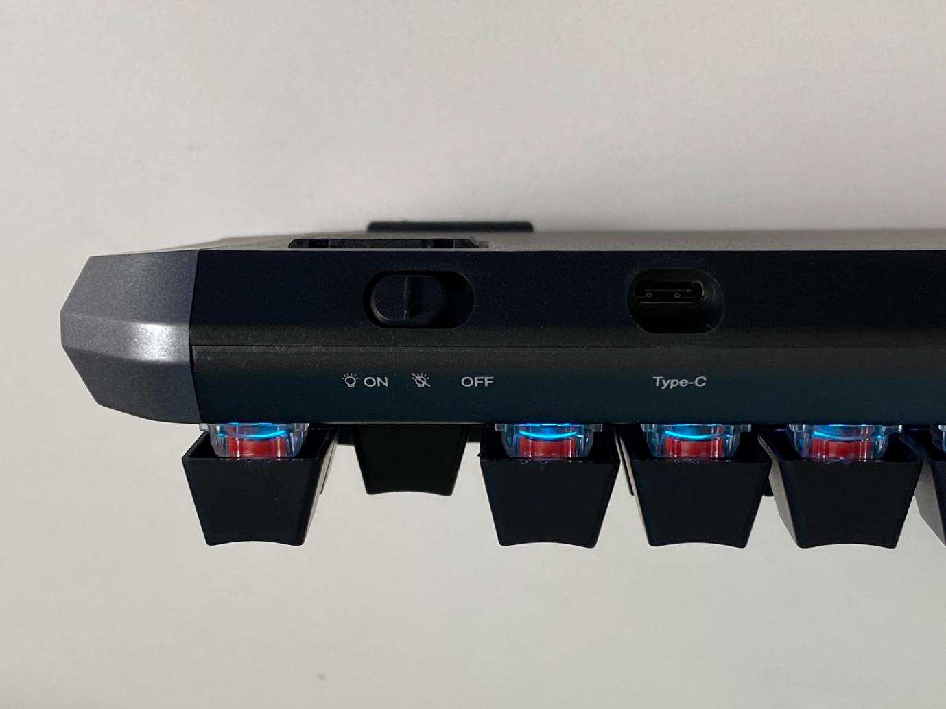 开关在键盘的左侧顶部,相对于开关在键盘背面,使用起来方便了不少。这里可以看见有个Type-C接口,是有线连接的,同时右侧有蓝牙开关。分别是OFF,还有2档分别是灯光关闭和灯光开启ON的字样。