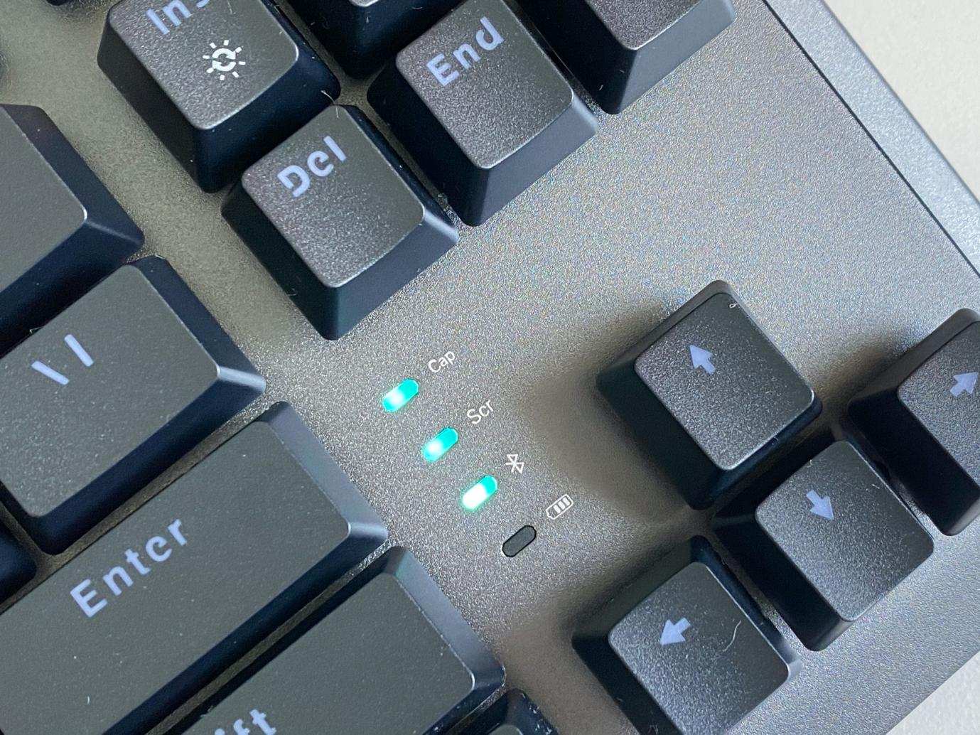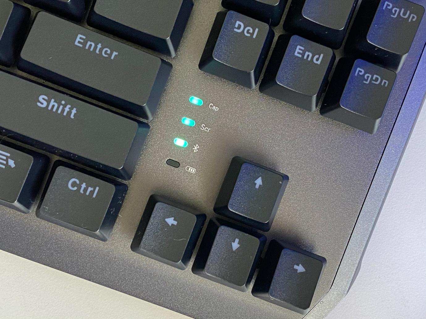 这款键盘是87键的,没有小键盘,但是有方向键。方向键的边上有四个指示灯,分别是CAP大写,Scr滚动锁定,蓝牙状态、电池电量。