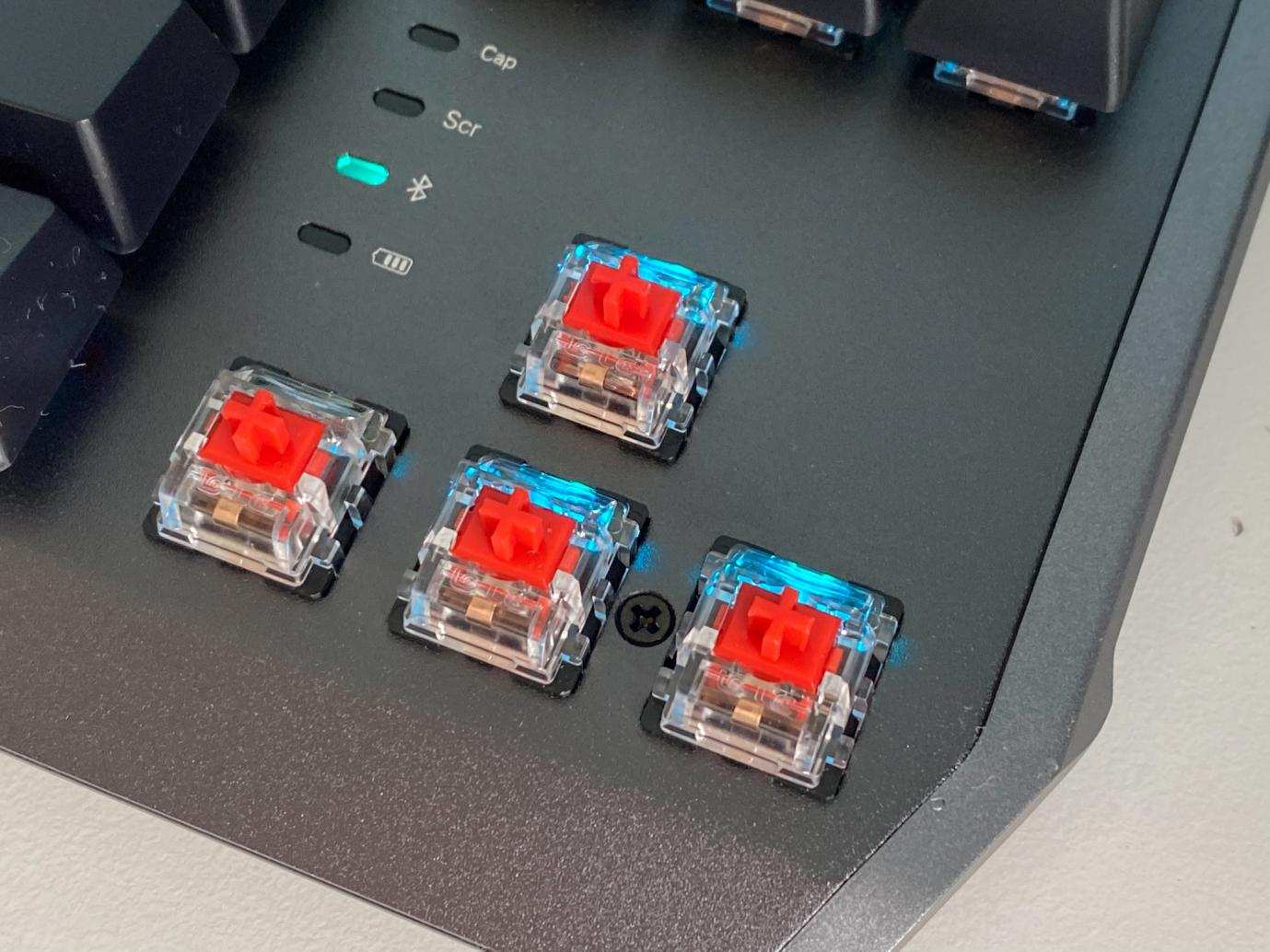 雷神的这款玄龙**械键盘是双模的,就是支持有线和蓝牙连接,从键盘上可以看到1-3数字键下面有蓝牙的标记,意味着可以连接给3个不同的蓝牙设备使用。使用组合键选择一个,那么该键位就会有灯光快闪。