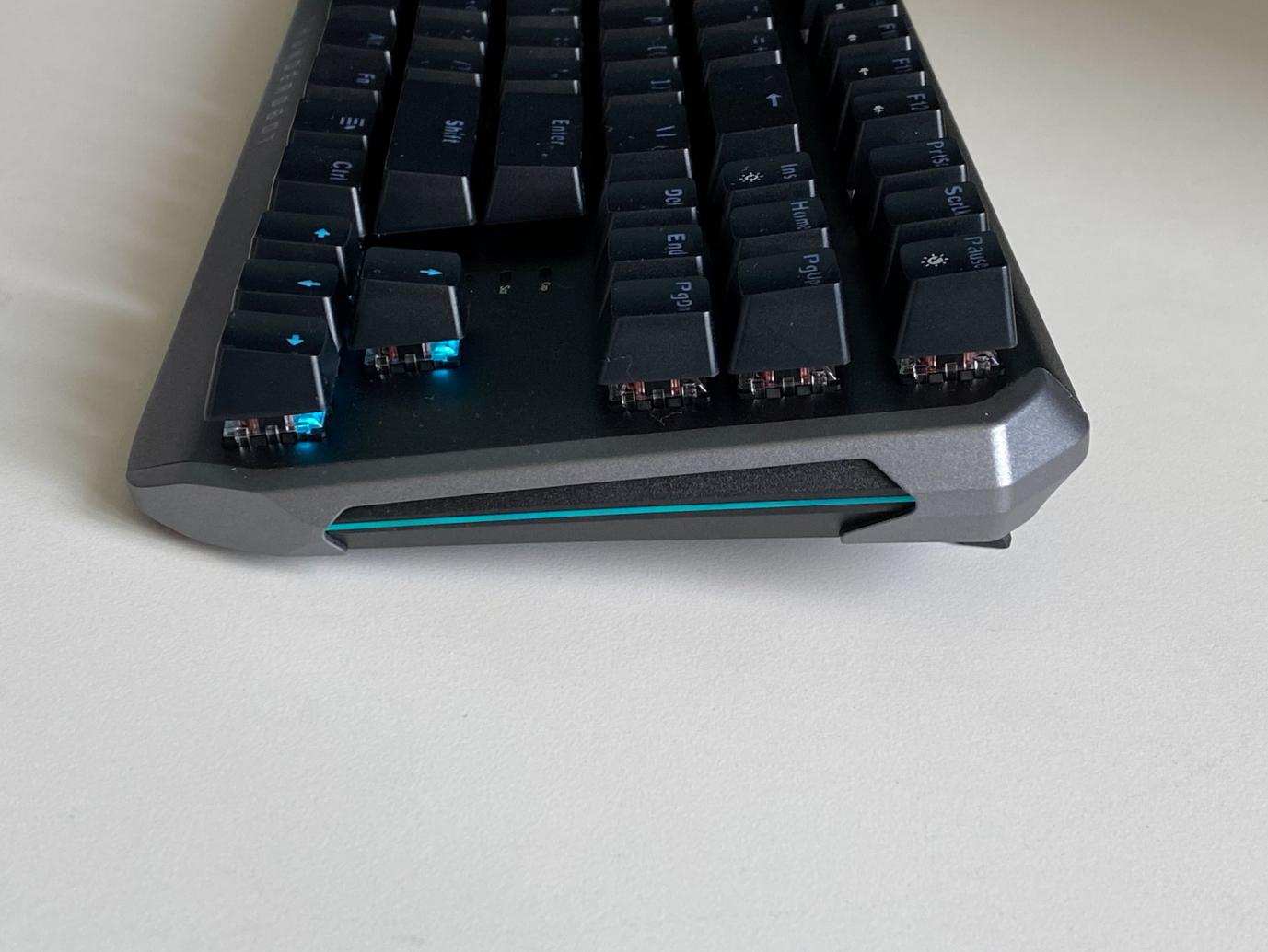从侧面观看,键盘按键的排列具有一定的人体工学角度,同时有流线造型和棱角的侧翼,而且根据介绍,侧板还具有RGB灯效的。