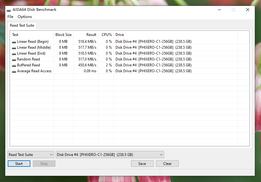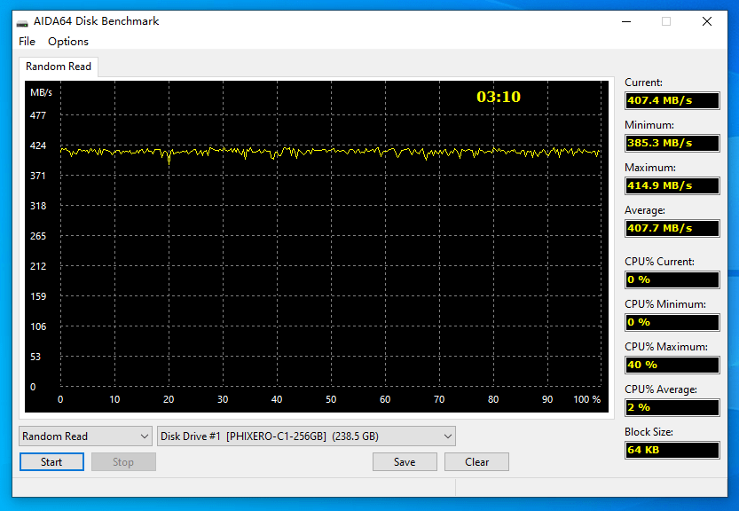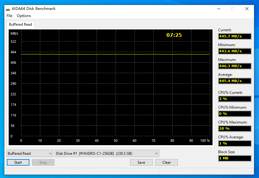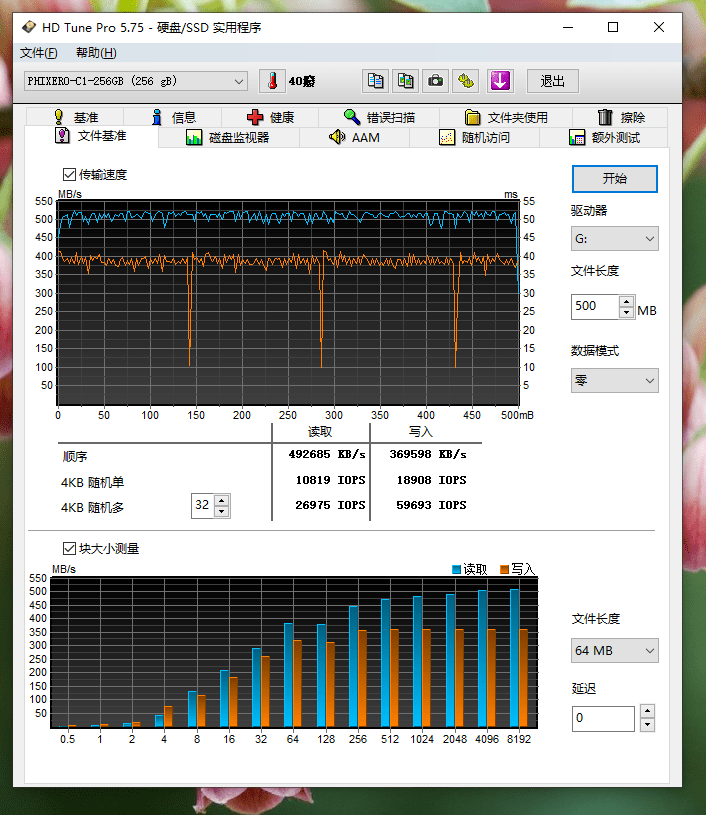 用HDTUNE,**PHIXERO C1 固态硬盘的读取速度在500MB/s以上,写入速度则在400MB/s,还是比较稳定的。