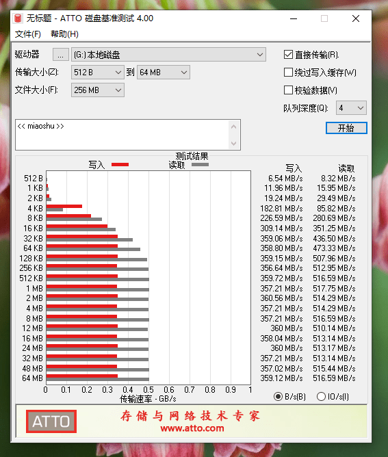 ATTO**,最终高速读取的速度可以达到516MB/s,写入速度则是359.12MB/s,这个速度也还可以的。