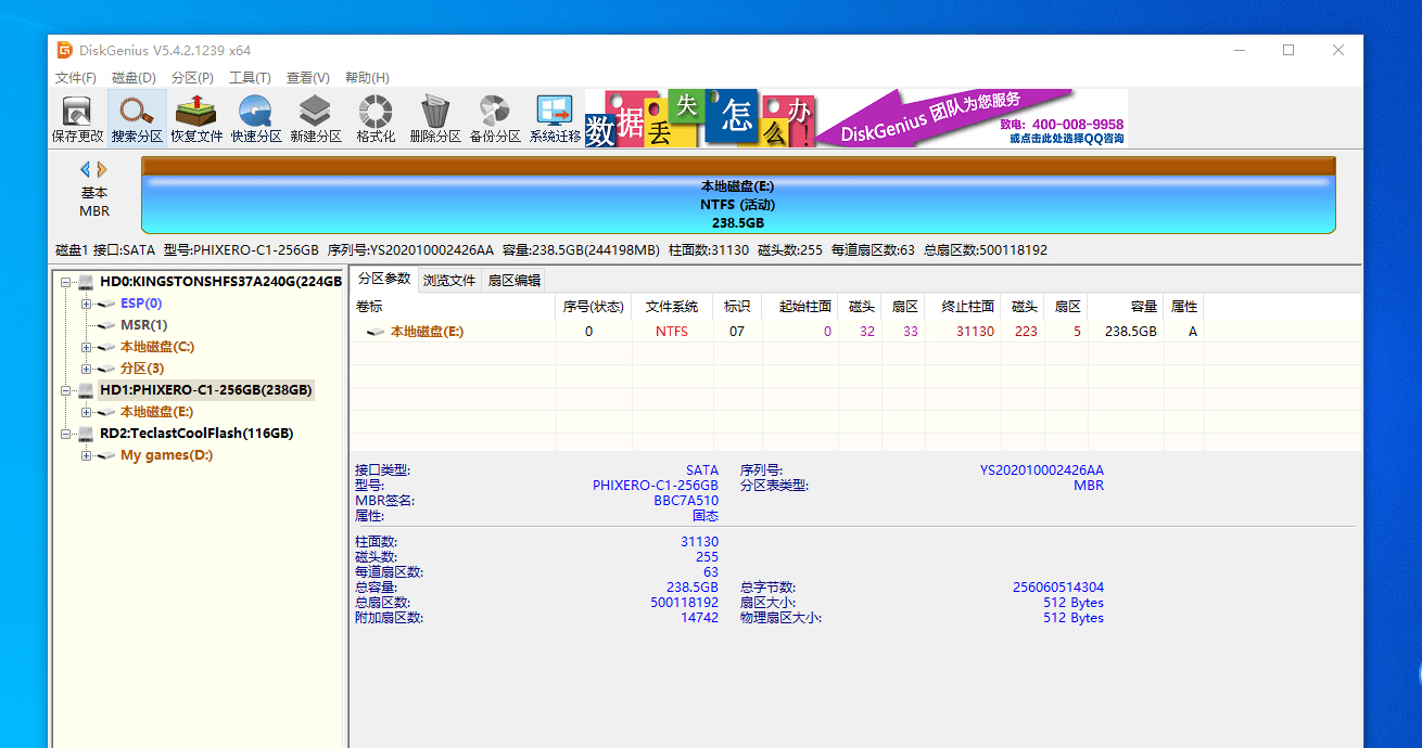新盘拿来,首先需要格式化,采用的是Disk Genius,格式化,自动对齐,格式为NTFS格式,容量238.5G。
