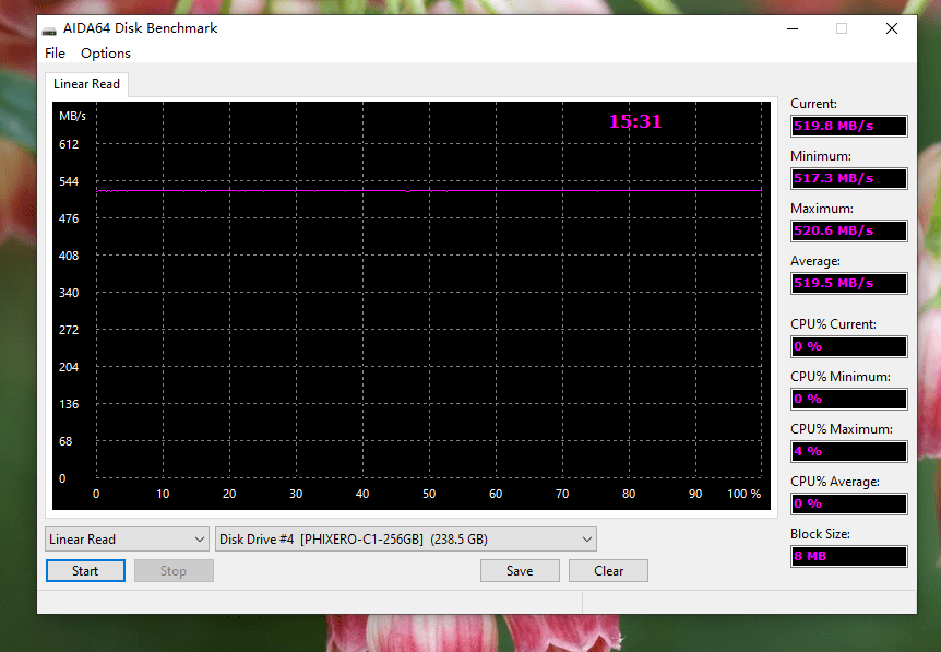 采用AIDA64**SSD心梗,可以看到线性读写的平均速度在518MB/s左右,随机读写的速度也在517MB/s,缓存在450MB/s,平均寻道时间0.09ms.专门的线性读写**中,最高速度更是可以达到520MB/s,只是缓存读取和随机读取的数值,稍微有点差别。随机读取似乎稍微有些低,平均也在407.7MB/s,Bufferread 则在445.4MB/s,虽然与**宣传的有些差距,但这个性能也确实还可以。