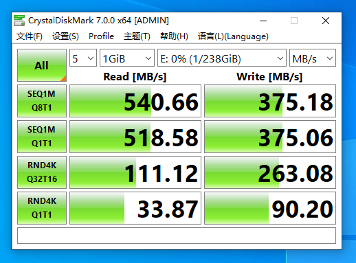 用Crystal Disk Mark7.0来进行**,读取速度540MB/s,写入是375.18MB/s,但是随即4K则不太理想,顺序读取坏写入倒还凑合。