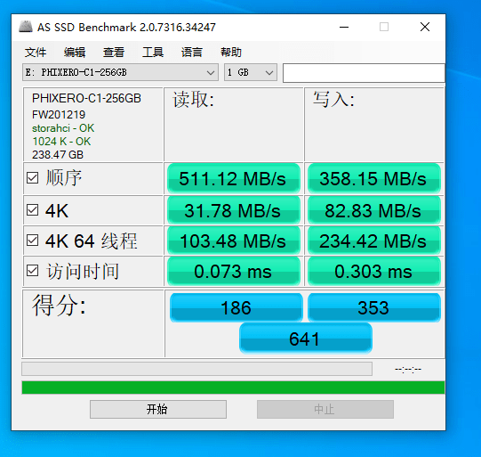 ASSD的**,PHIXERO C1 固态硬盘的顺序读取在511MB/s,而写入则在358.15 MB/s,总体评分641,4K的成绩有些不太理想,不过这个成绩也还可以了。