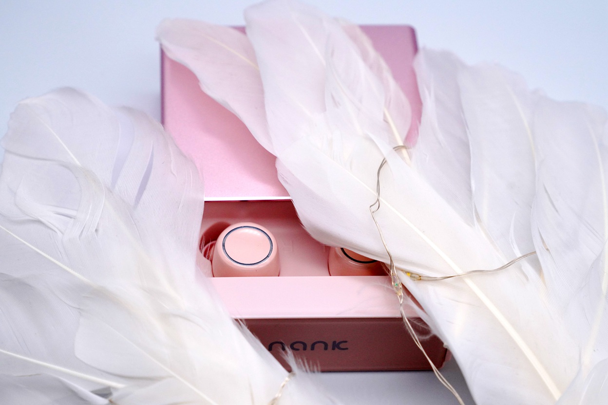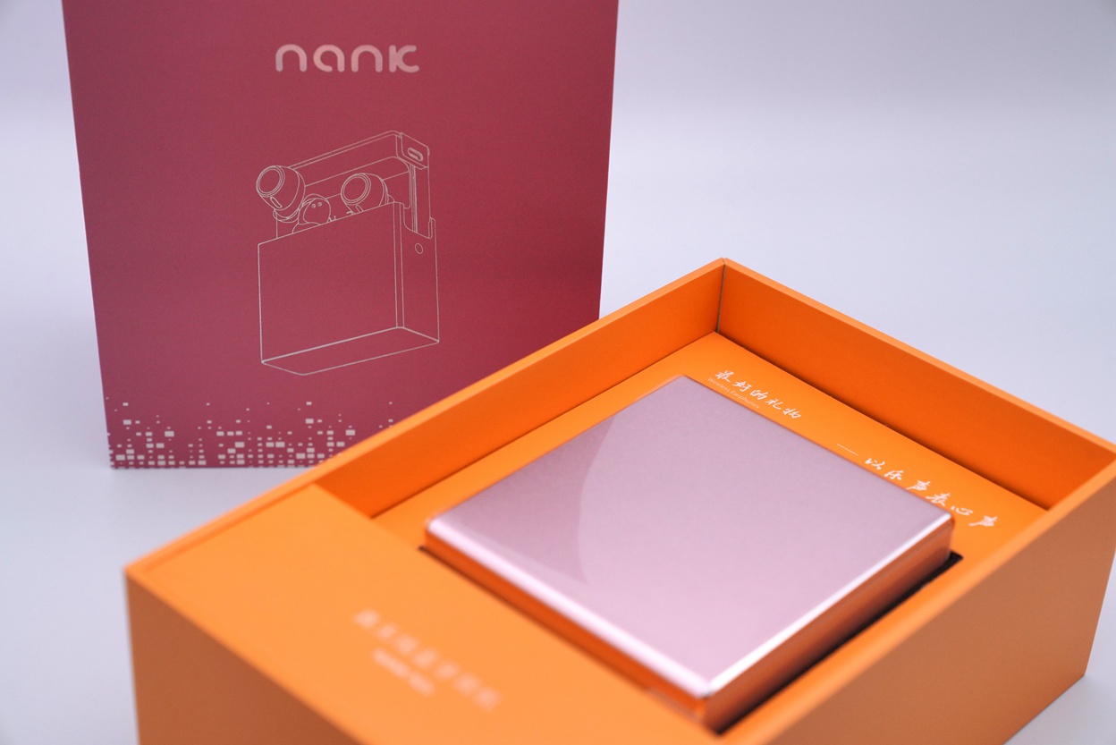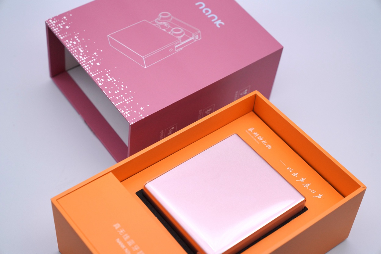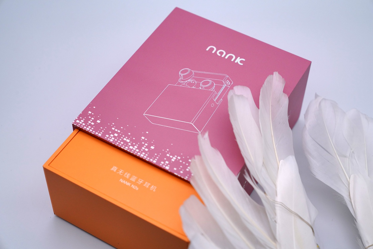 南卡N2s延续了上代的设计风格,粉橙撞色带来了一股小清新的风格,烫银的产品图片也显得格外高端,整个盒子有一种礼品的感觉。