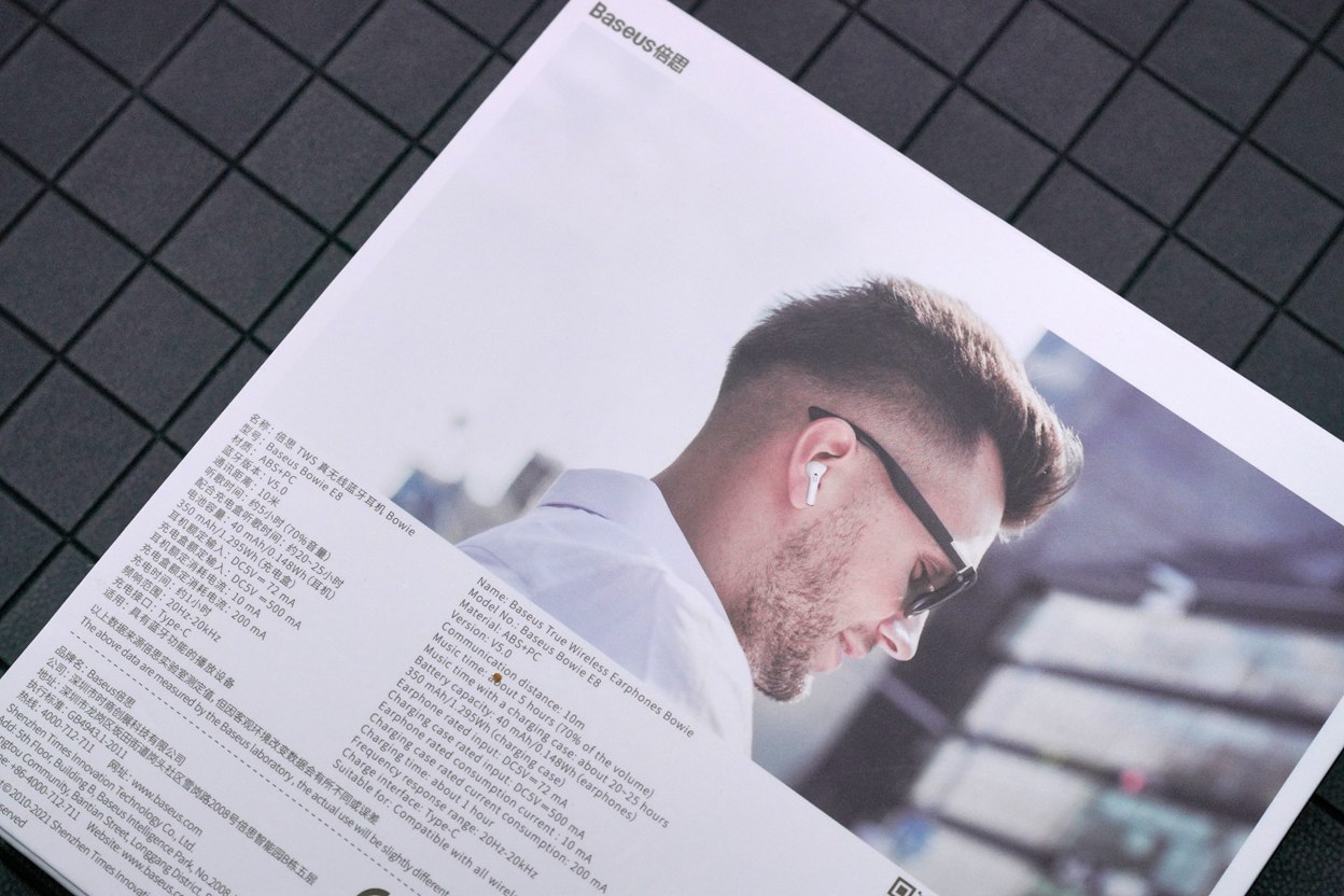 倍思Bowie E8的外包装采用了简洁的设计风格,正面印有耳机的高清图片、背面详细介绍了耳机的参数。