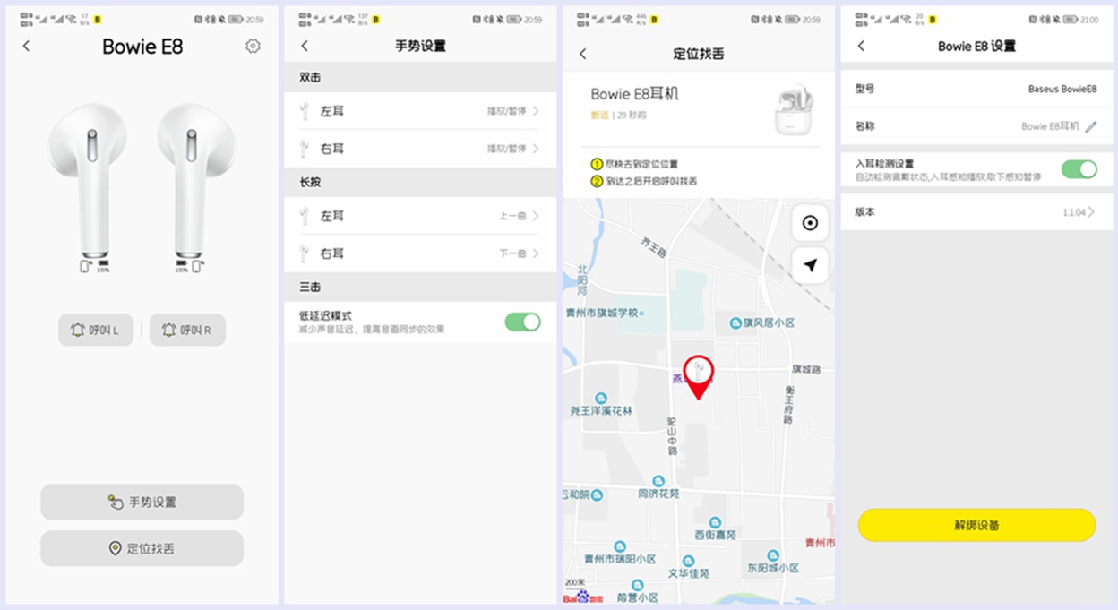 此外,我们还可以通过“倍思”APP对耳机进行设置。在APP中我们可以实时查看耳机电量、快速定位查找耳机,还可以给耳机取一个个性的名字。并且查找耳机功能又细分为呼叫查找和地图定位,这下耳机想丢也不太容易了。