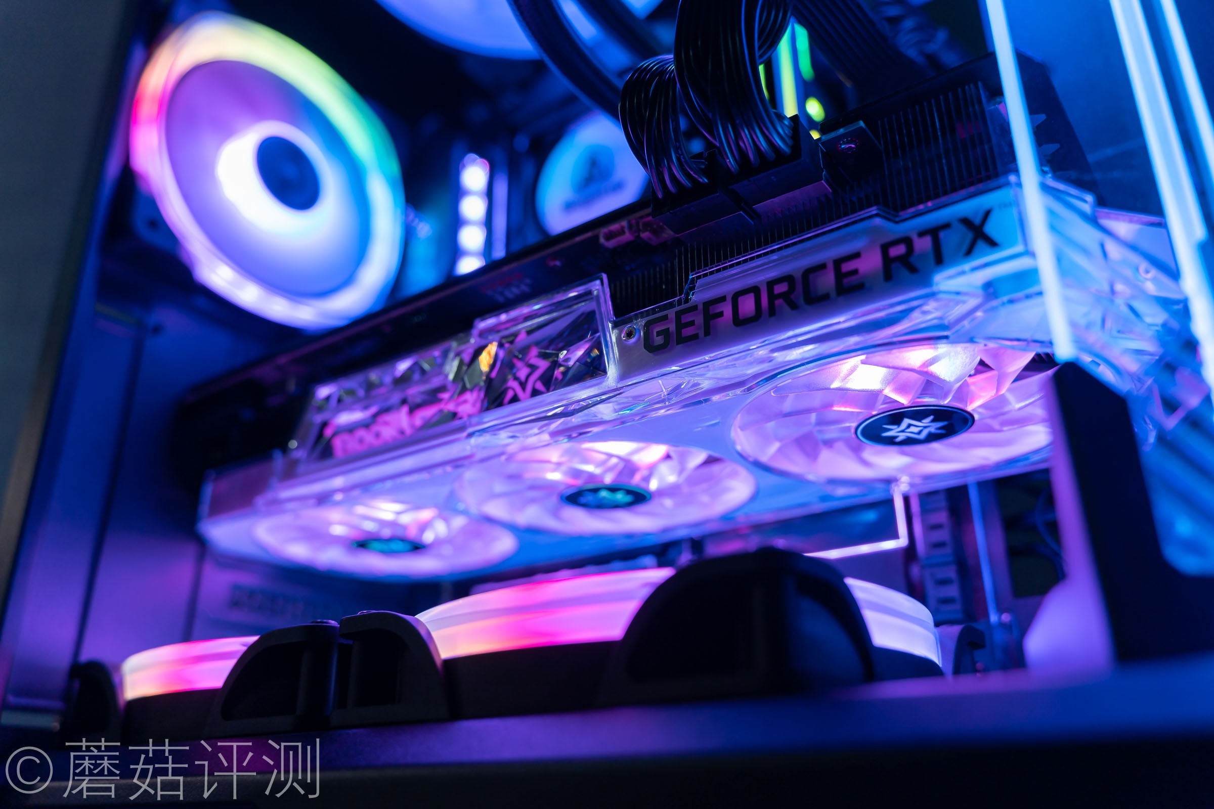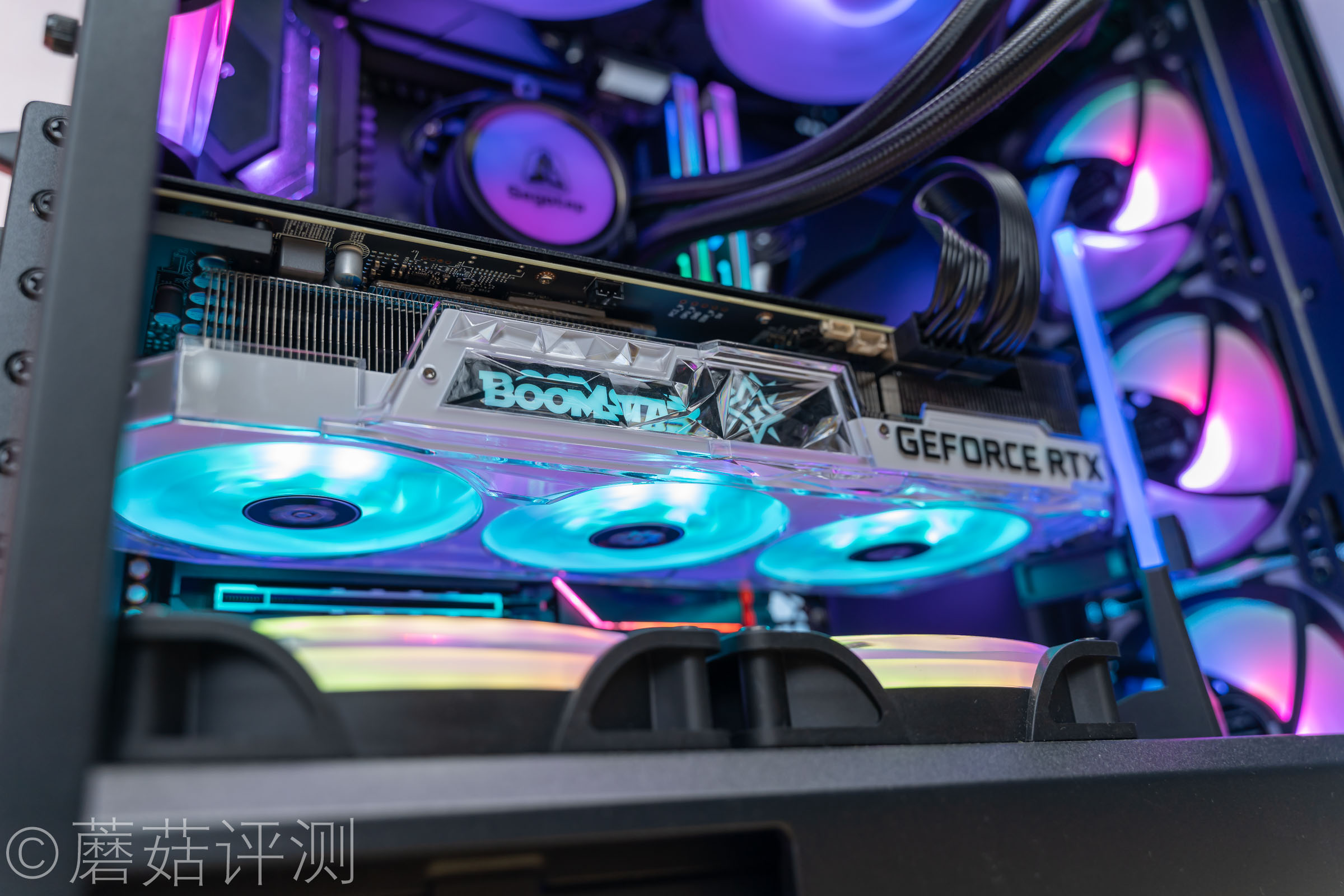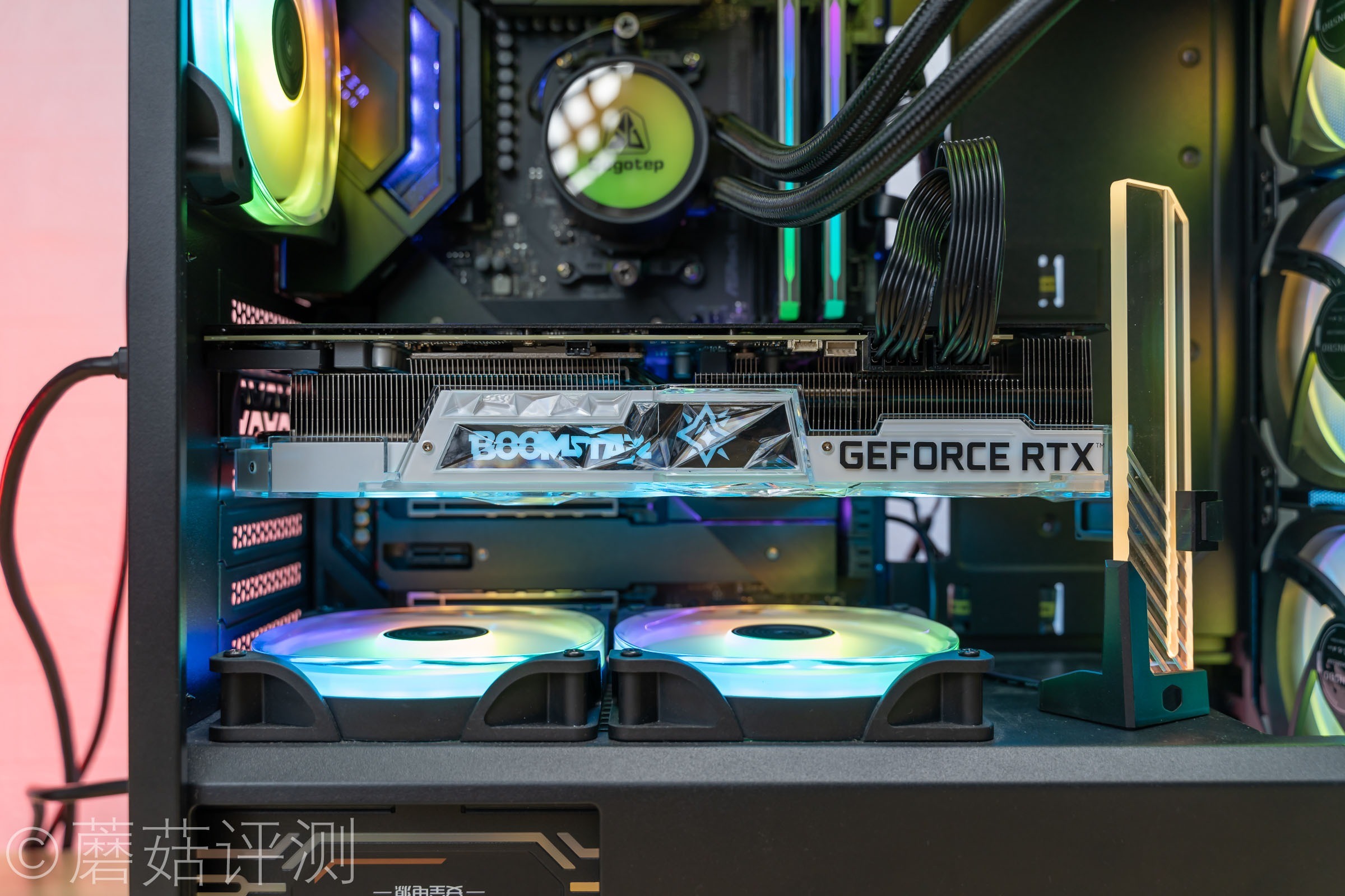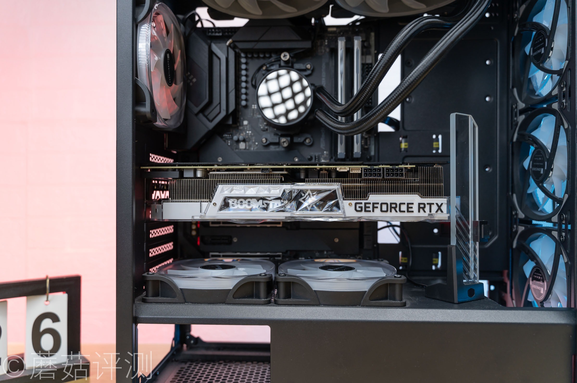 ▼显卡可以轻松的水平安装,记得要在显卡的尾部装一个显卡支架哦,蘑菇这里选了一个好看的。