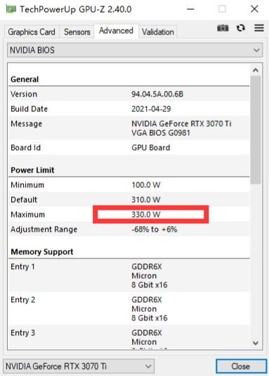 ▼简单看下显卡的BIOS,最大功耗330W。