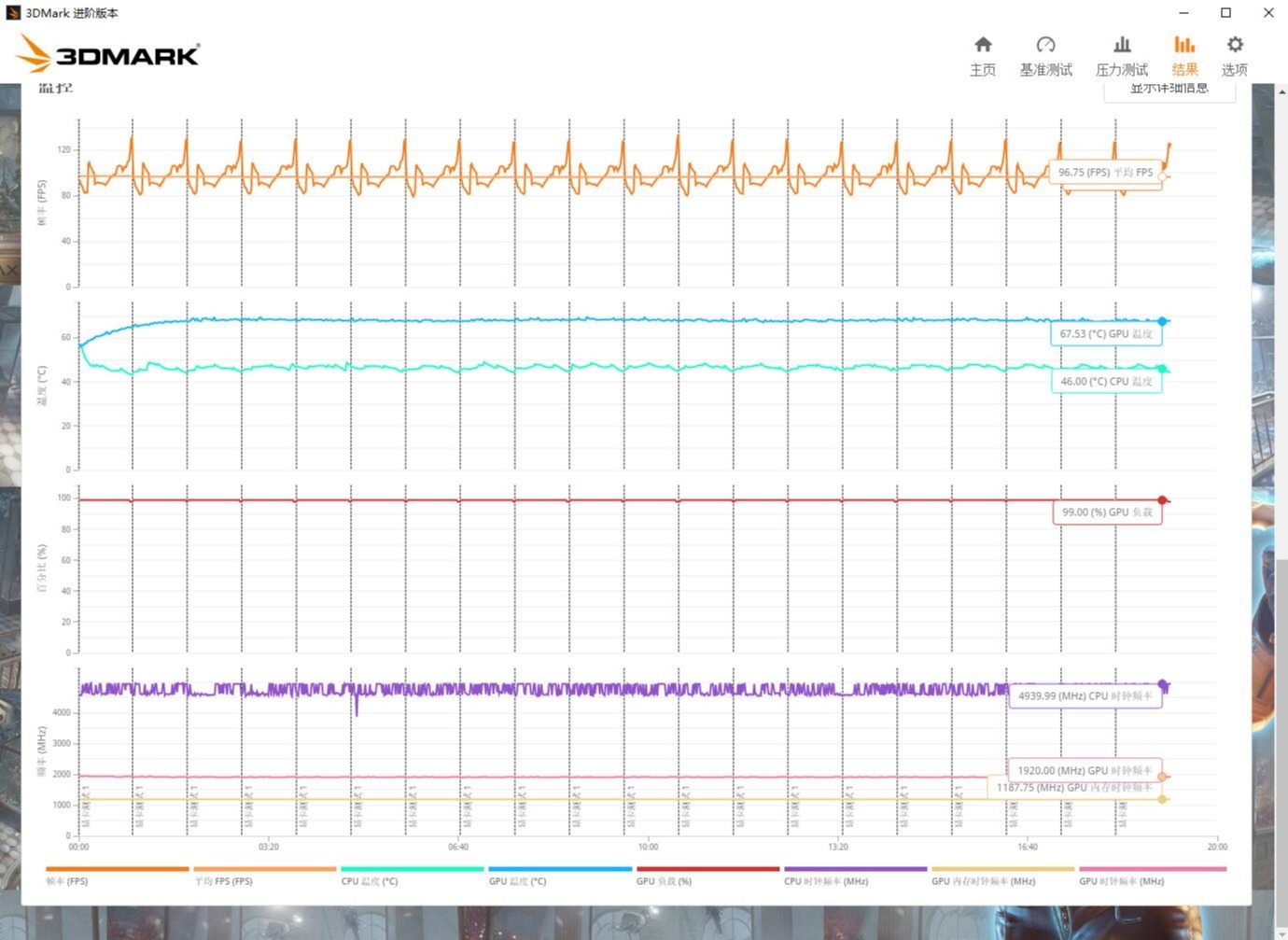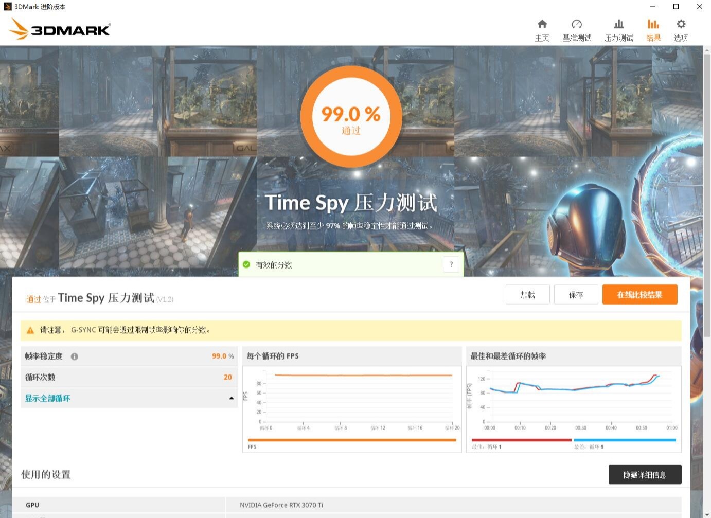 ▼最后跑一下3Dmark的压力**,帧数稳定率99%,还是很稳定的。