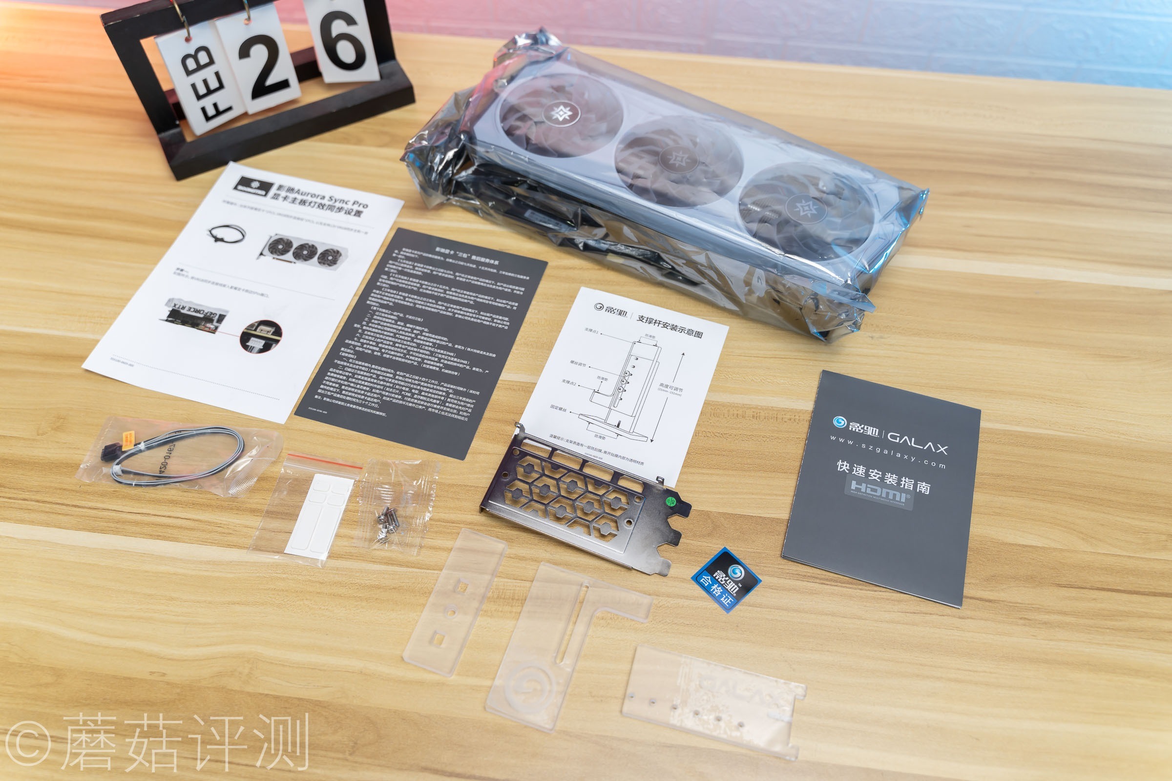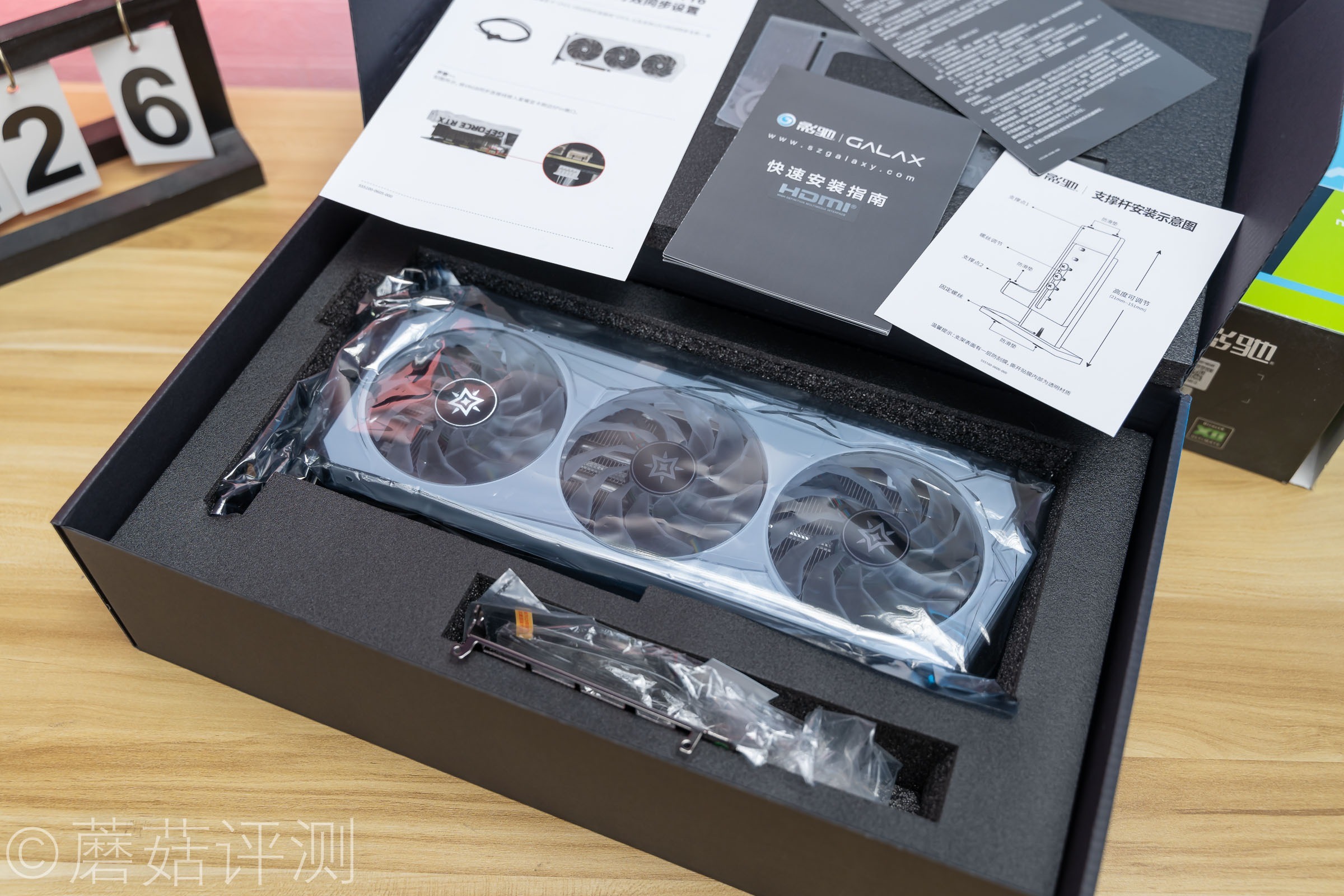 ▼影驰这张显卡很不错,除了说明书、保修卡之类的配件之外,还标配了显卡支架、双槽挡板(已换上)、灯效线。
