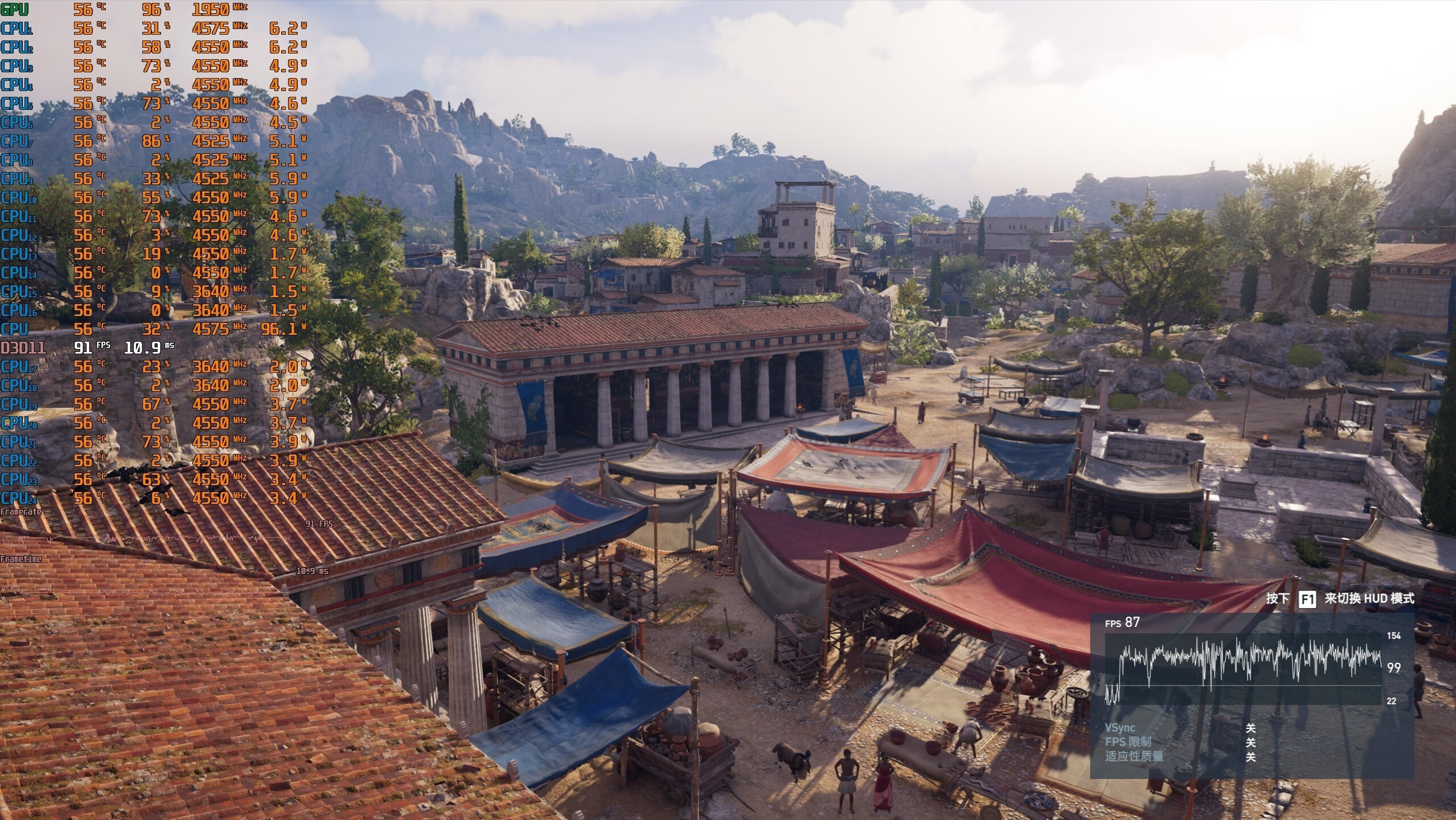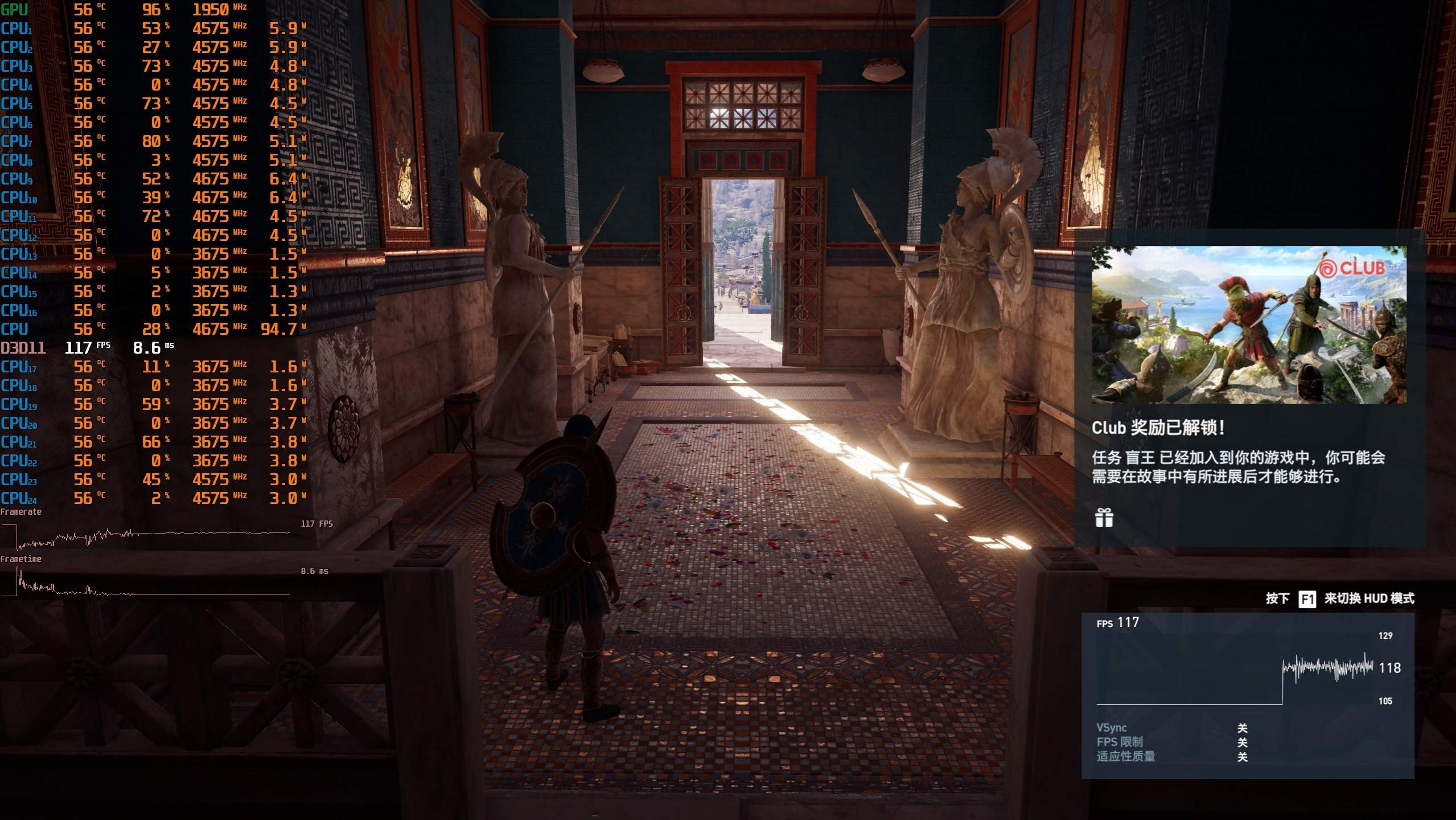 ▼众生平等奥德赛,2K分辨率,全极高画质,体积云最低,走廊游戏帧数在117帧左右。