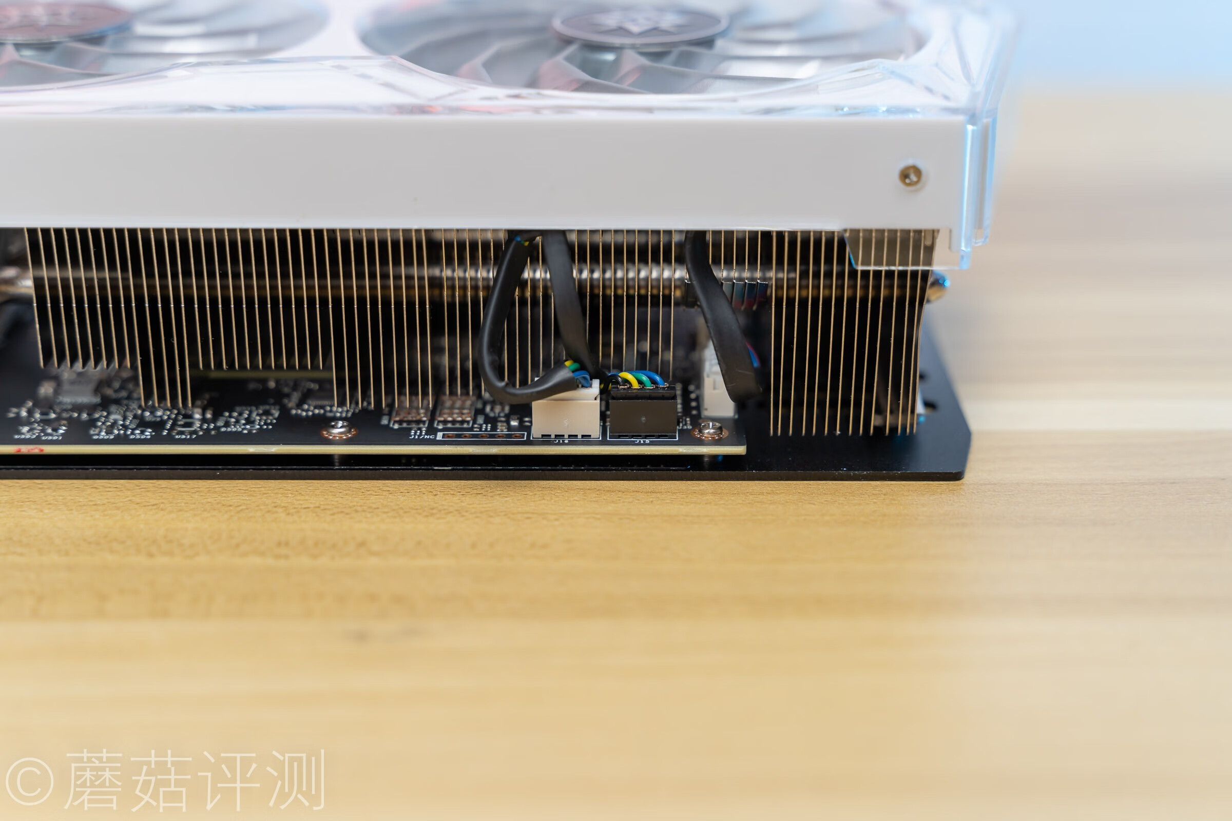 ▼显卡尾部有风扇、灯效插座,风扇貌似是两个插座,分组控制三把风扇。