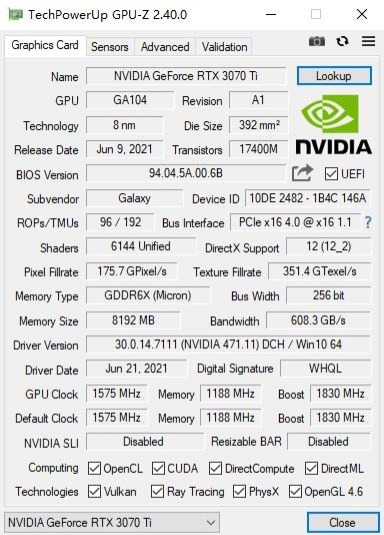 ▼简单看一下GPU-Z,核心是GA104,流处理器6144,显存8G,镁光的GDDR6X,不错不错。