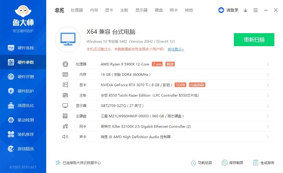 ▼先看一下整机配置,处理器5900X,主板是华擎的B550太极雷蛇,内存是扎达克,显卡是影驰的RTX3070Ti星耀OC。