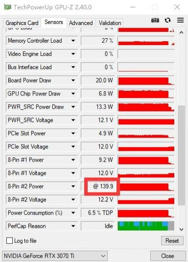 ▼烤鸡的时候,单8Pin的输入功耗最大在140W左右,两根总共280W,剩下的PCIe供电在30W左右。